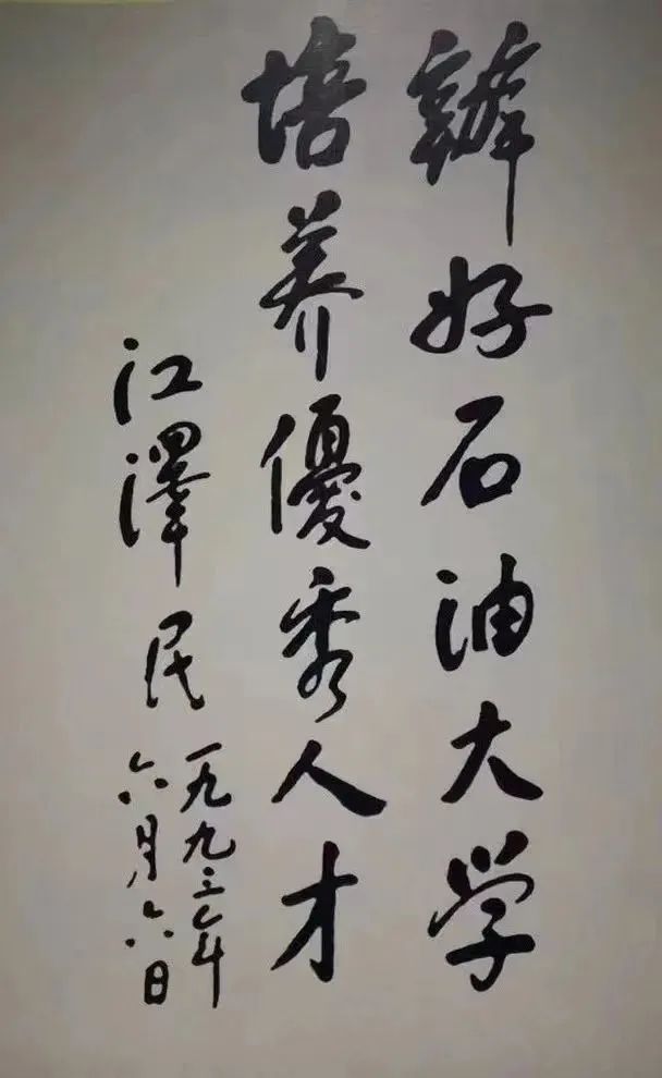 1993年6月6日,在学校即将迎来40周年校庆之际,江泽民同志亲笔题词:“办好石油大学,培养优秀人才”,对学校事业发展和人才培养提出殷殷期望,极大地鼓舞了广大师生服务国家能源战略需求的使命担当。