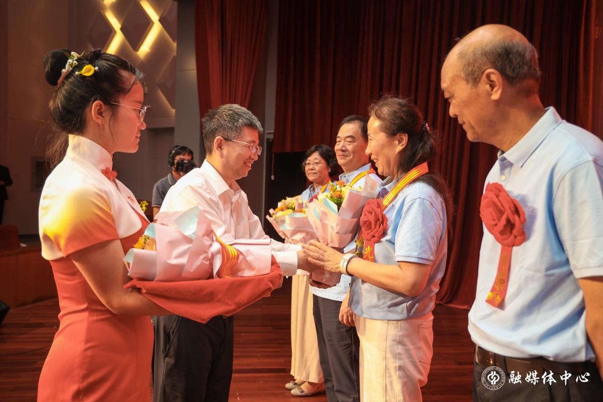 韩克飞和刘植昌为从教三十年的教师代表颁发证书和纪念奖牌。致敬他们三十载的奉献付出,以及“躬耕教坛、强国有我”的使命担当。