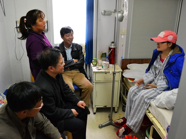 在任晓云母亲的陪同下,理学院领导走进了北京三医院血液科的病房。病床上的任晓云对领导的到来表示了感谢。病床前郭绍辉书记说:“我们代表