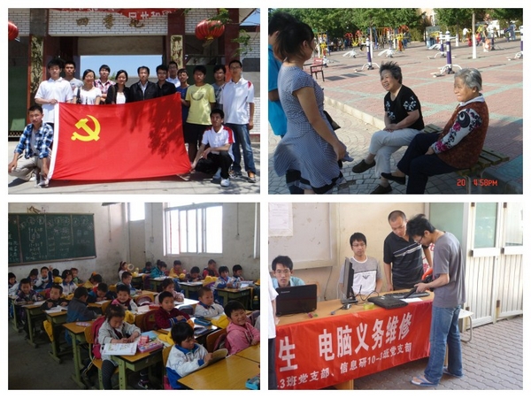 另外,一些党支部紧密围绕“创先争优做表率、我为党旗添光彩”积极开展主题实践活动。在红色“1+1”支部共建活动中,学生党支部深入新农村、走访老党员,慰问老年人,赴农民工子弟学校支教。在志愿服务过程中,部分党支部进行电脑义务维修,打扫实验室,赴北京人与动物环保科普中心义务服务,清理城市白色垃圾等。实践过程中充分展现了学生党员的精神面貌,体现了学生党员的先进性。
