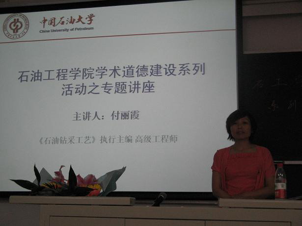 6月13日,石油工程学院在二教107教室举行了“遵循学术规范,严守学术道德”主题讲座。《石油钻采工艺》执行主编、高级工程师付丽霞应邀做了精彩报告。
