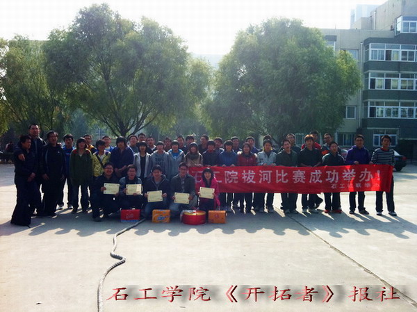 10月28日,石工学院拔河比赛决赛在北校区南广场举行。参加本次拔河比赛的有石工学院学生会、研究生会、社团联合会、开拓者报社以及青年志愿者协会,经过三天的激烈角逐,石工学院学生会摘得冠军。