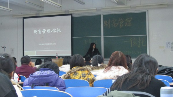 董旻靖以通俗易懂的语言讲述了当今社会财富以及投资的状况,阐释了财富的定义以及投资的理念。随后,她向同学们展示了信托的概念、由来以及其实质,还用生活中理财的实例与在场的同学一起讨论。现场的氛围积极活跃,同学们踊跃的参与到她的问题之中,收获理财方面的知识。