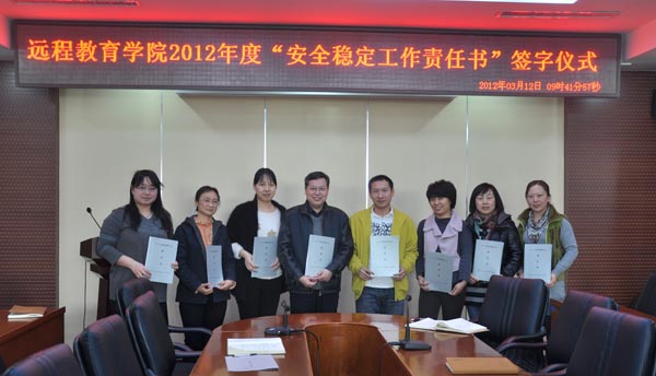 3月12日上午,远程教育学院举行2012年度安全稳定工作责任书签订仪式,院长张云祥与各部门负责人签订了《2012年度安全稳定工作责任书》。