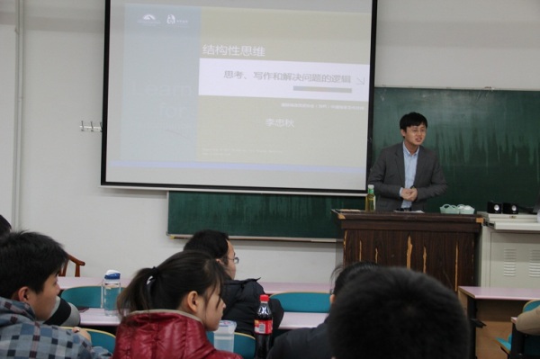 李忠秋以“思考、写作和解决问题的逻辑”为主题,辅以生动的实例为英雏们讲授了“归纳法”、“演绎法”等诸多有助于商务写作的结构性论证方法。参加培训的学生干部积极参与课堂讨论,培训会上气氛热烈。