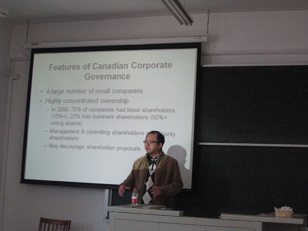 杨军为在座的学生们详细地讲述了加拿大未撤回的各类股东提案,填表人身份和投票结果的关系。他的研究表明机构投资者和散户组织的提案对投票结果的影响显著高于个人投资者提案的影响,这些影响集中体现在目标公司的股价上。由于加拿大文化背景及公司治理结构的独特之处,市场反应也与其他国家有差异。