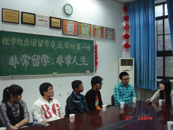 为进一步拓宽就业途径,提高学生国际化视野,以讲座、沙龙、交流等形式为学院有出国留学意向的同学提供信息交流平台,理学院团委指导学生创办了OEEA出国留学俱乐部,并于4月27日,举办了首场出国留学交流会,此次交流会以“非常留学,非常人生”为主题。交流会邀请到在加拿大留学的石大优秀毕业生分享了自己的留学经历,并就学校的选择、材料的准备、奖学金的申请、国外学习生活的差异等问题给大家提供了很好的建议。