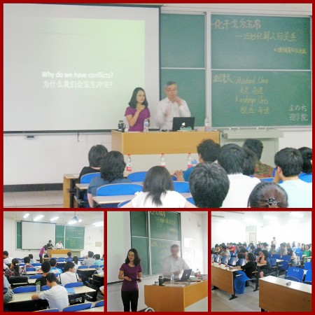 讲座中,两位专家分别从性别、性格以及文化背景等方面的因素详细讲解了冲突产生的原因和巧妙化解交际冲突的方法,并通过糖果游戏生动的阐述了托马斯解决冲突二维模式,并提出解决冲突首先要自醒等需要注意的关键因素。