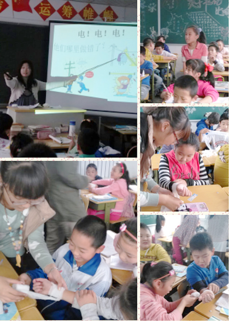 在课程开始时,志愿者与孩子们讨论了创可贴的使用注意事项,还教授了4种系绷带的方法,并播放视频、亲自演示操作步骤。孩子们在接下来的实践活动中积极互动参与,又一起学习了如何预防中暑、中暑后应当怎么办,以及如何安全用电等安全健康常识。