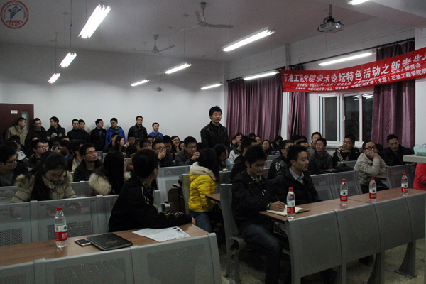 3位研究生分别为大家详细地介绍了塔里木油田开发事业部采油工程部、中海油钻采院和中国石油集团钻井工程技术院三个工作站的自然条件、工作条件和生活条件,并讲述了在工作站实习期的经历和体会。他们强调,在实习工作中一定要敢于创新,把握机会,多学习,多沟通,带着足够的热情投入到工作和生活中去。在互动环节中,同学们积极参与,提出自己的问题,3位研究生都做了耐心细致的解答。熊文学还针对就业和升学的问题与大家进行了较为深入的交流。