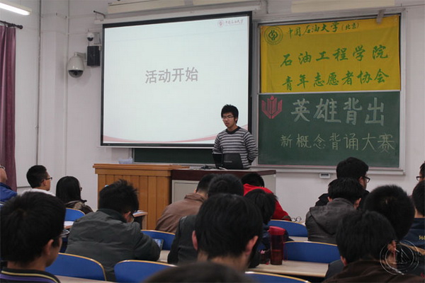 11月8日晚,石油工程学院青年志愿者协会在三教108举办“英雄背出”新概念英语单词背诵大赛。