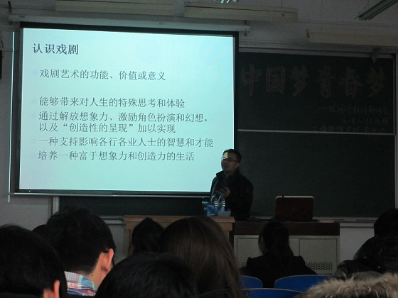 11月21日晚,石大工商管理学院在三教举行题为“中国梦,青春梦”的校园原创话剧讲座。本次讲座邀请到了外国语学院孙兆勇担任主讲。
