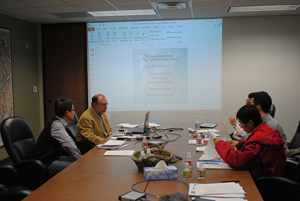 培训中,哈丁公司总裁Michael D.Bumaman作为主讲人,对美国非常规油气开发的发展历史、发展现状及发展趋势进行了介绍,并针对页岩气和致密油水平井钻完井技术、水力压裂技术等方面进行了着重讲解。代表团成员则针对培训过程中遇到的各种问题与主讲人进行了交流。培训结束后,代表团向Michael D.Bumaman赠送了《全国石油工程设计大赛的宣传册》与《第四届全国石油工程设计大赛实施方案》。Michael D.Bumaman向代表团赠送了Barnett页岩气田储层页岩样品并祝福大赛能够越办越好。