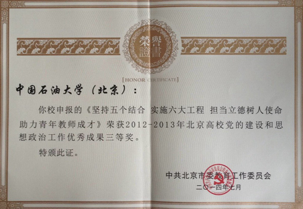 近日,中共北京市委教育工作委员会发布了《关于表彰2012-2013年北京高校党的建设和思想政治工作优秀成果、创新成果的决定》,中国石油大学申报的“基于服从国家重大战略需求的‘驻外学生’党建工作全面覆盖的探索与实践”、“坚持五个结合实施六大工程 担当立德树人使命 助力青年教师成才”2项成果分别荣获“2012-2013年北京高校党的建设和思想政治工作优秀成果”二等奖和三等奖。