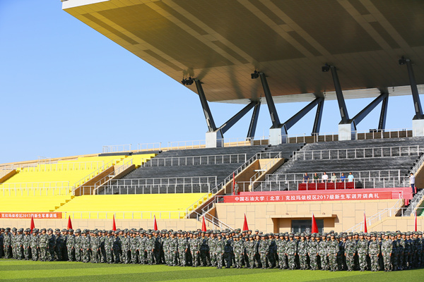 开训典礼在热烈的掌声中结束,720多名同学将身着迷彩戎装开始为期2周的军事训练。同学们除了进行队列、阅兵式、具有石油特色野外拉练、军体拳、警棍盾牌术、武术等训练外,还将观看军理题材电影、参加入学教育等系列活动。