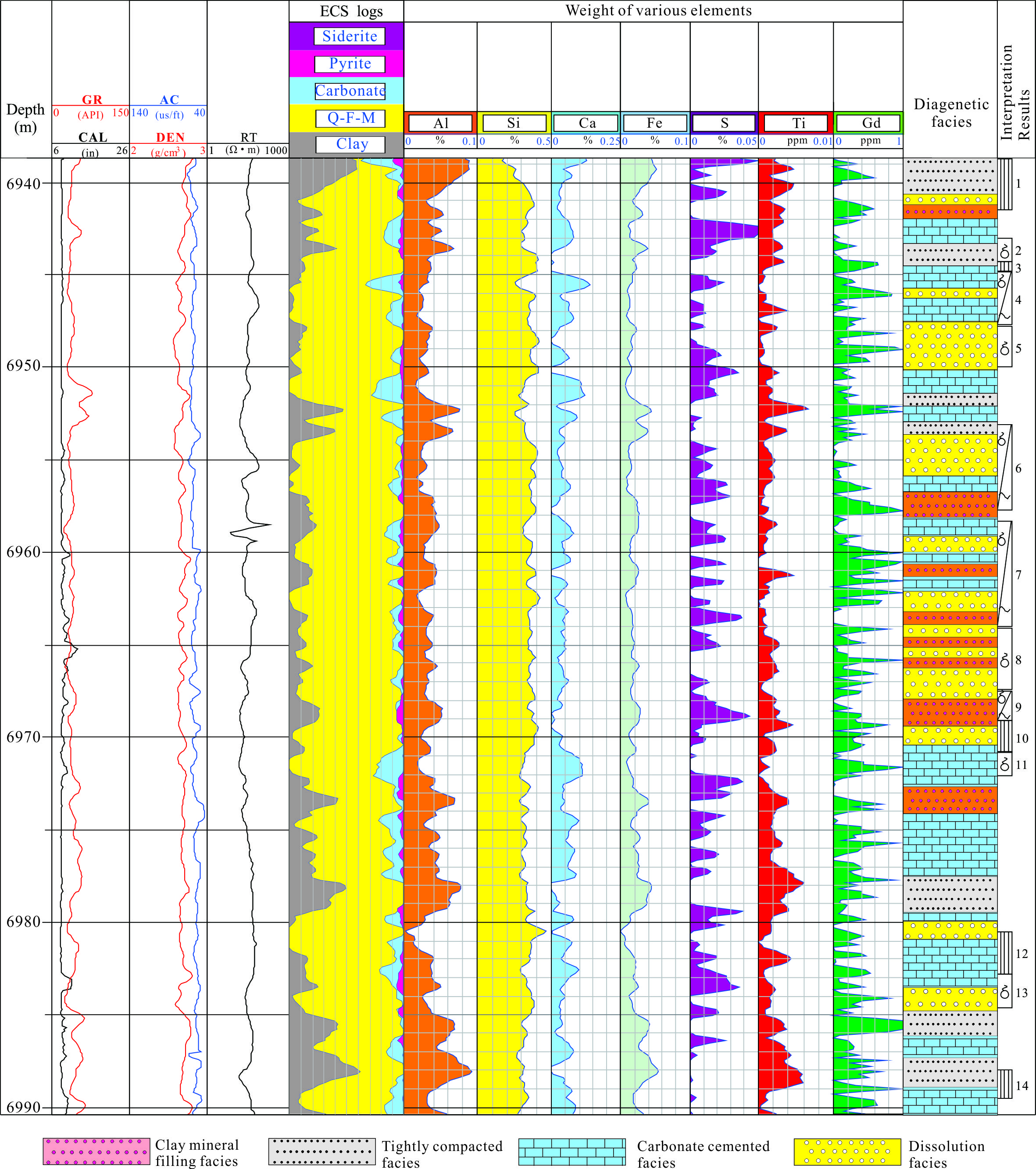 致密砂岩储层成岩相测井识别评价方法正处于储层地质学与测井地质学交叉前沿领域。地学院测井地质学研究团队在国家自然科学基金和油气重大专项等项目资助下,近五年来在王贵文教授带领下致力于成岩相分类体系和测井评价方法的研究工作,取得一系列重要成果。该论文1)归纳总结了四川盆地须家河组、鄂尔多斯盆地延长组以及库车坳陷巴什基奇克组等致密砂岩储层成岩相的分类体系和识别方法;2)阐明了不同成岩相储层宏观物性和微观孔隙结构特征,恢复了不同成岩相成岩演化序列和孔隙演化史;3)并进一步深入剖析了不同成岩相在不同测井曲线组合上(常规测井以及元素俘获ECS测井等)的响应特征;4)最后提出了基于储层经历成岩作用和强度定性判定以及指示性成岩矿物含量精确计算的成岩相测井识别与定量评价方法。