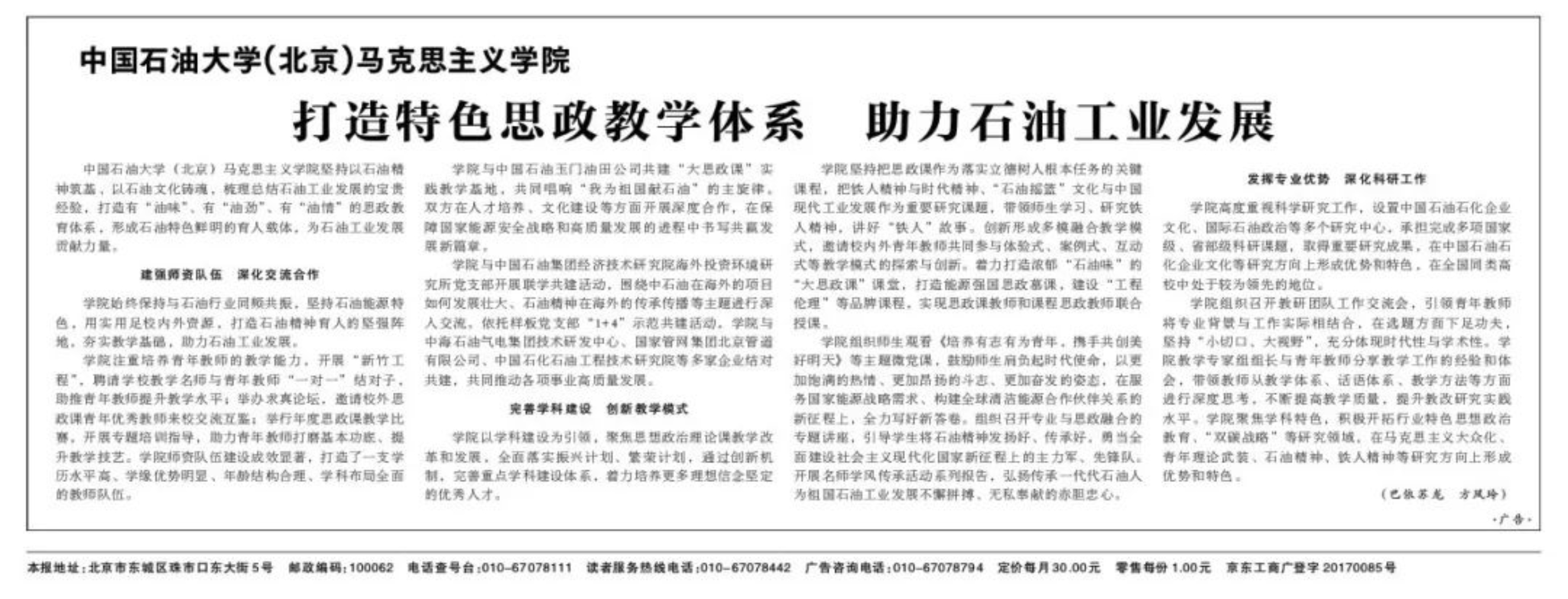 在习近平总书记发表“3·18”座谈会重要讲话五周年之际,光明日报刊发了介绍中国石油大学(北京)马克思主义学院打造特色思政教学体系、助力石油工业发展的相关报道。
