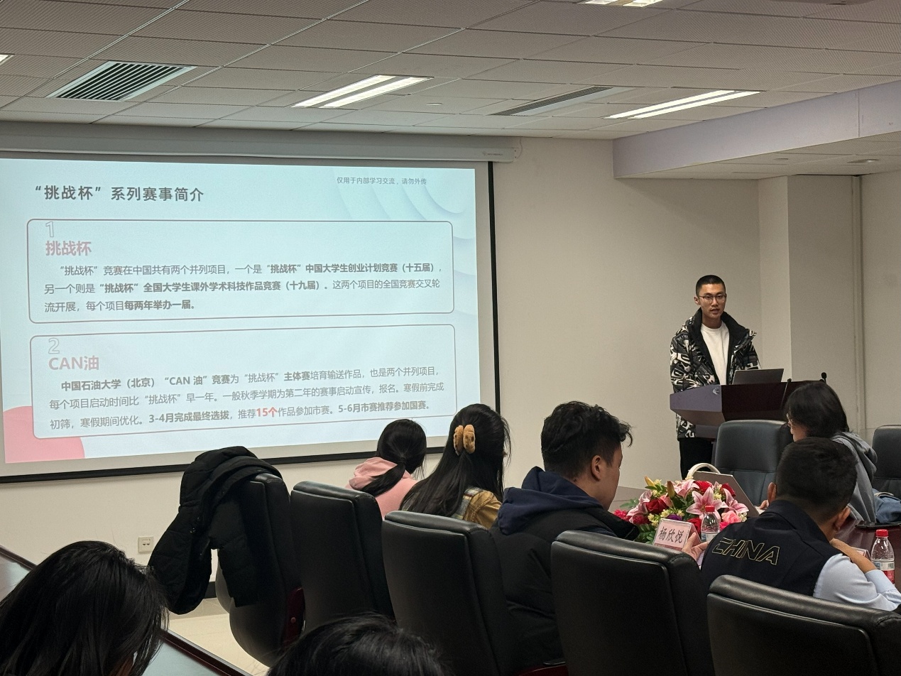 王晓彤向同学们解读了竞赛政策,清晰梳理了“挑战杯”大学生创业计划竞赛的赛事定位,详细介绍了主体赛五大主题方向及“一带一路”等专项赛道,明确了校赛至国赛的完整流程与关键时间节点。同时,他还详解了奖项设置与保研加分机制,让同学们直观了解赛事含金量。
