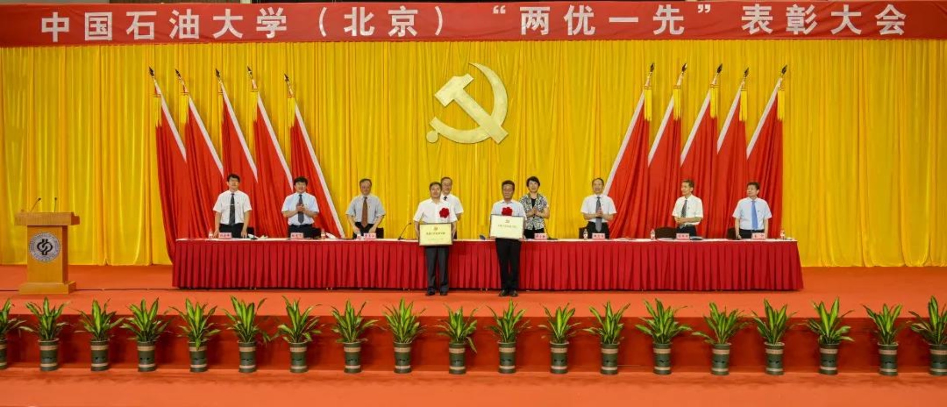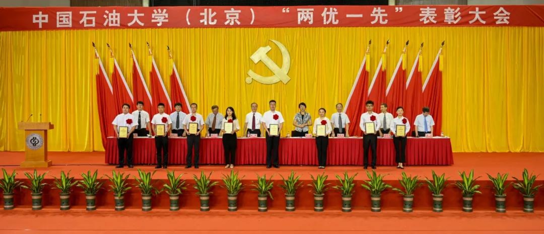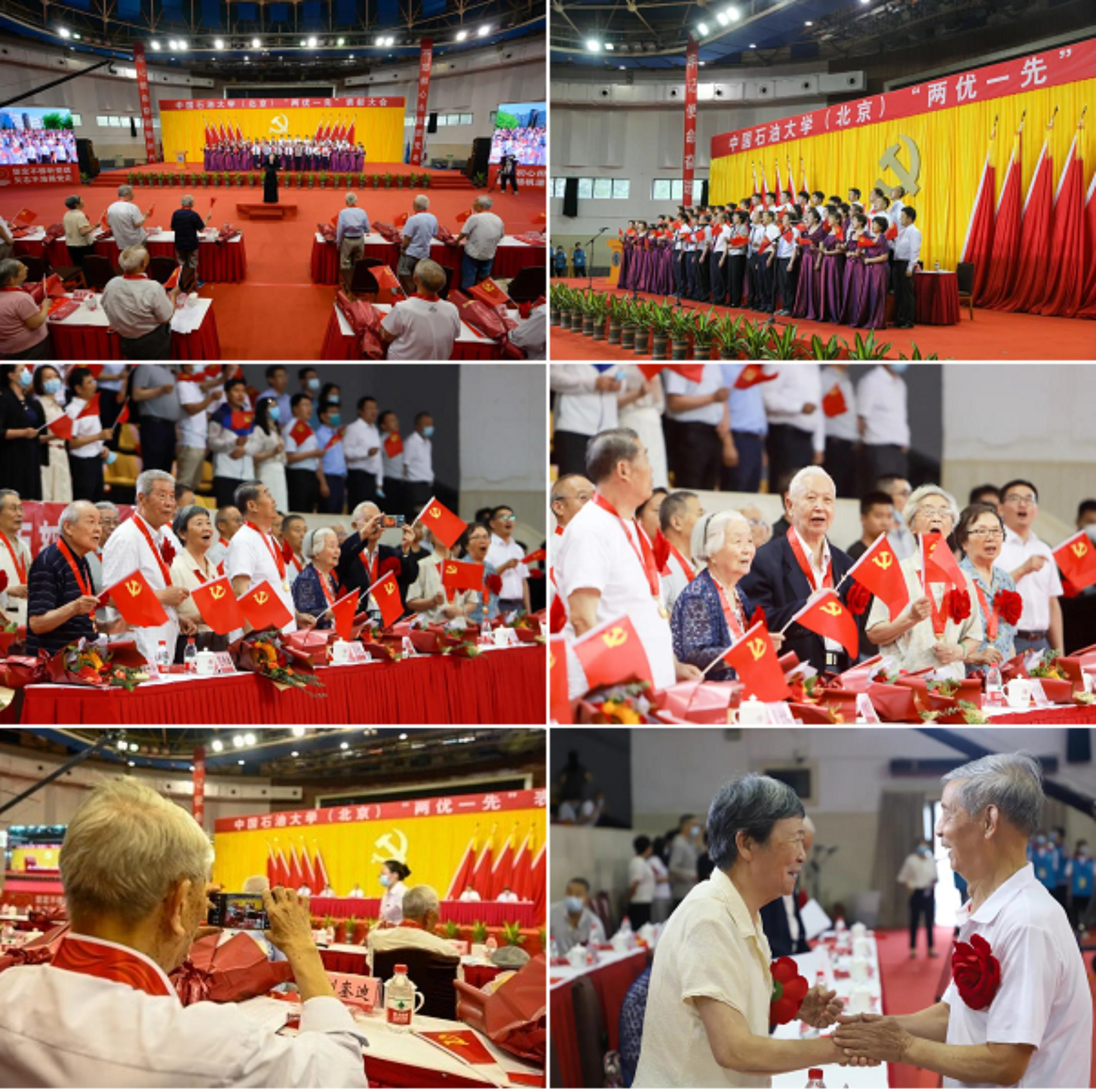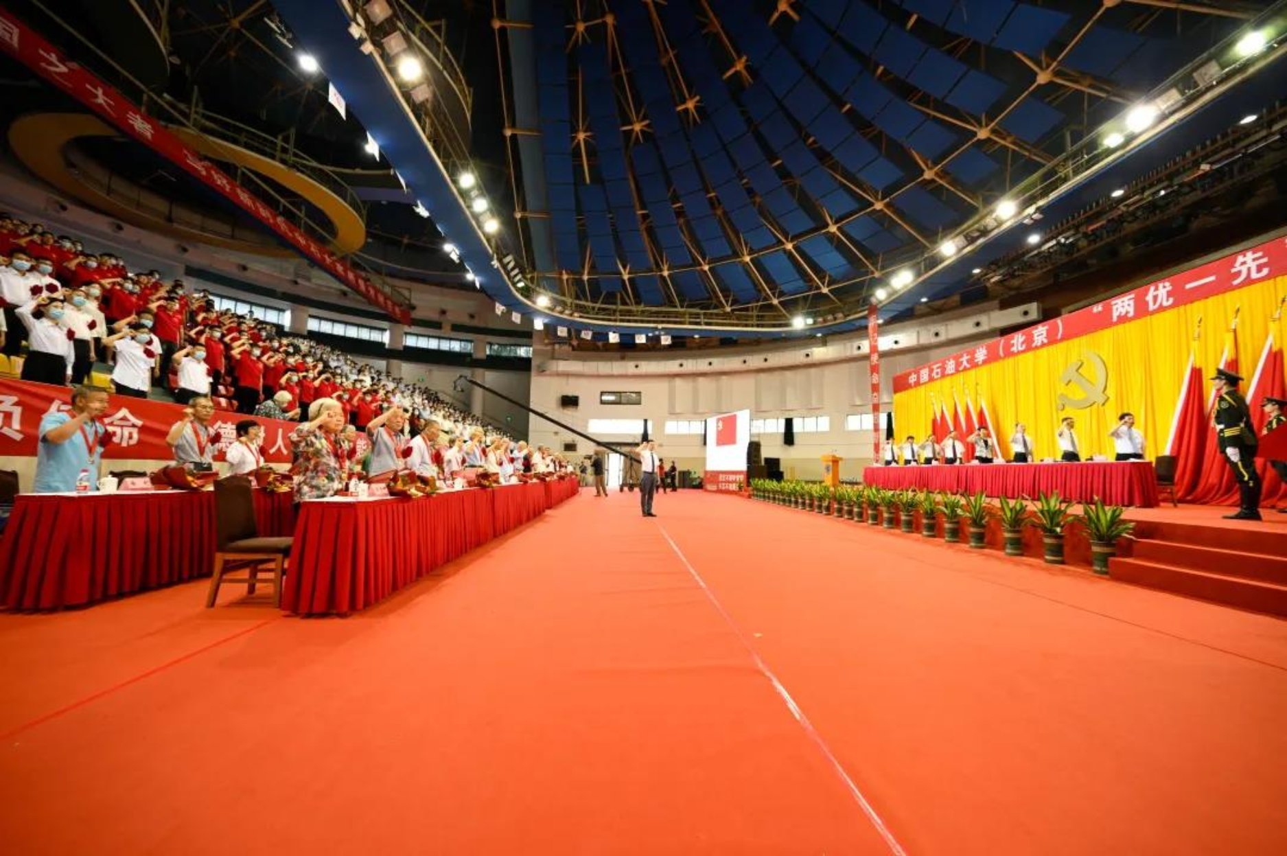 初心如磐,使命在肩。6月29日下午,中国石油大学在体育馆召开“两优一先”表彰大会,热烈庆祝中国共产党成立100周年,隆重表彰先进集体和个人。校领导陈峰、吴小林、雷玉江、鲍志东、韩克飞、付恒升、韩尚峰、金衍,校长助理刘植昌,“光荣在党50年”老党员代表,全体先进党组织书记、优秀共产党员和优秀党务工作者,其他受表彰单位和个人代表,全体处级干部、预备党员代表、师生党员代表等近460余人参加表彰大会。副校长陈大恩和克拉玛依校区师生党员代表通过视频连线方式参加了表彰大会。会议由校长、党委副书记吴小林主持。