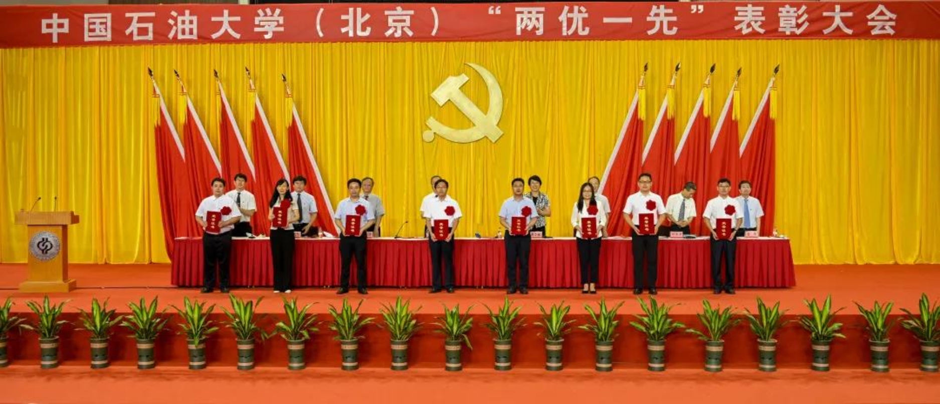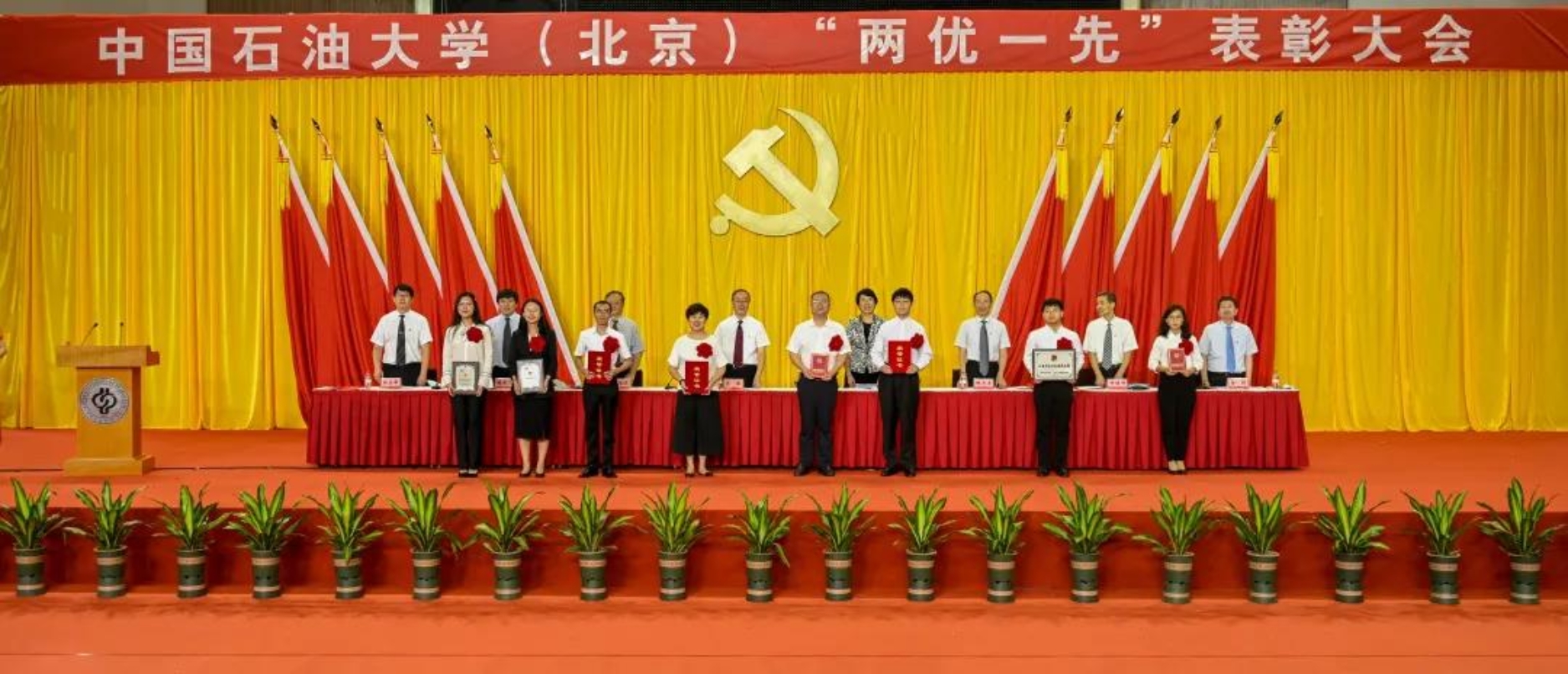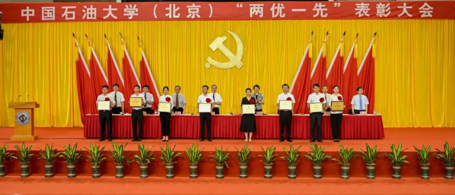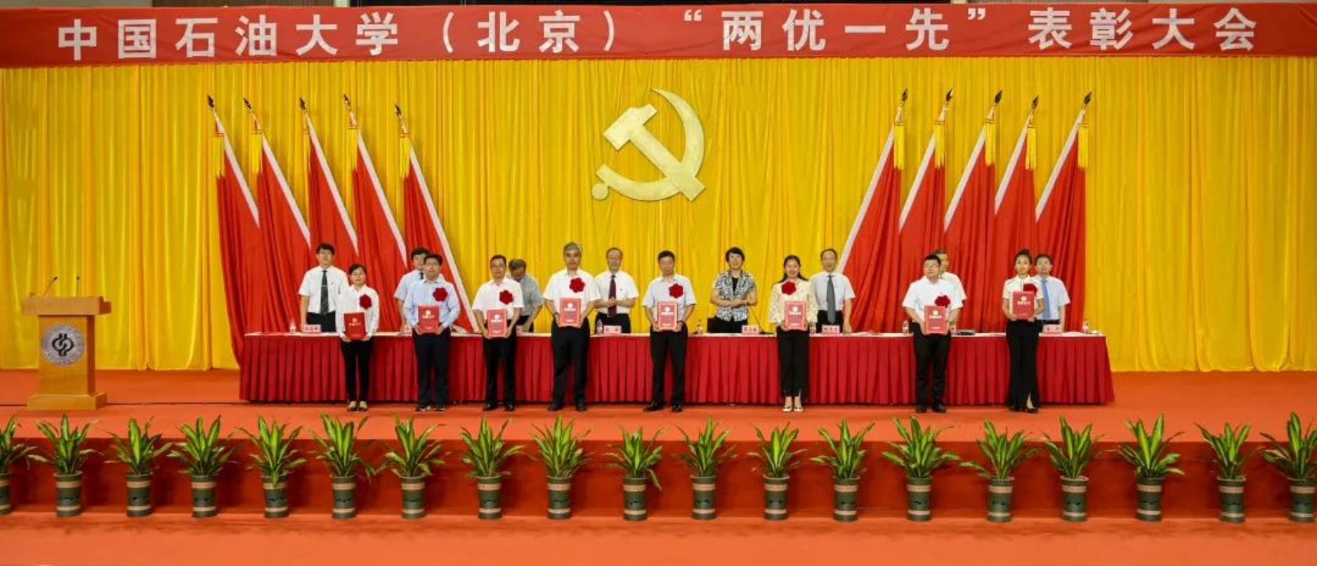 初心如磐,使命在肩。6月29日下午,中国石油大学在体育馆召开“两优一先”表彰大会,热烈庆祝中国共产党成立100周年,隆重表彰先进集体和个人。校领导陈峰、吴小林、雷玉江、鲍志东、韩克飞、付恒升、韩尚峰、金衍,校长助理刘植昌,“光荣在党50年”老党员代表,全体先进党组织书记、优秀共产党员和优秀党务工作者,其他受表彰单位和个人代表,全体处级干部、预备党员代表、师生党员代表等近460余人参加表彰大会。副校长陈大恩和克拉玛依校区师生党员代表通过视频连线方式参加了表彰大会。会议由校长、党委副书记吴小林主持。