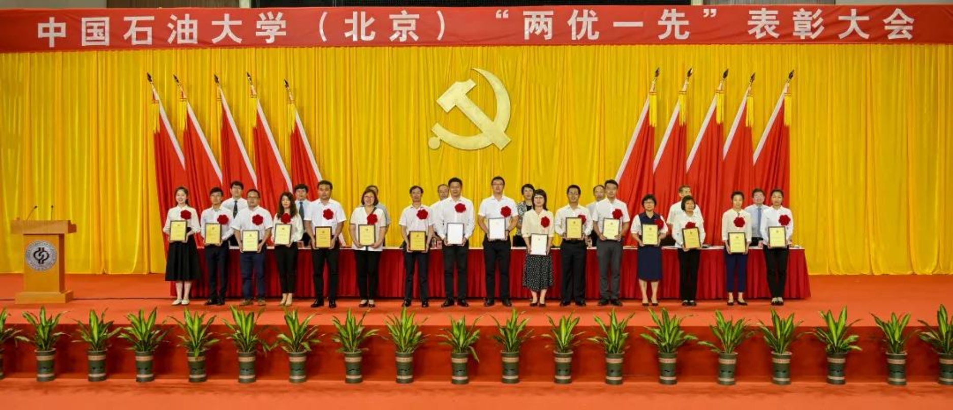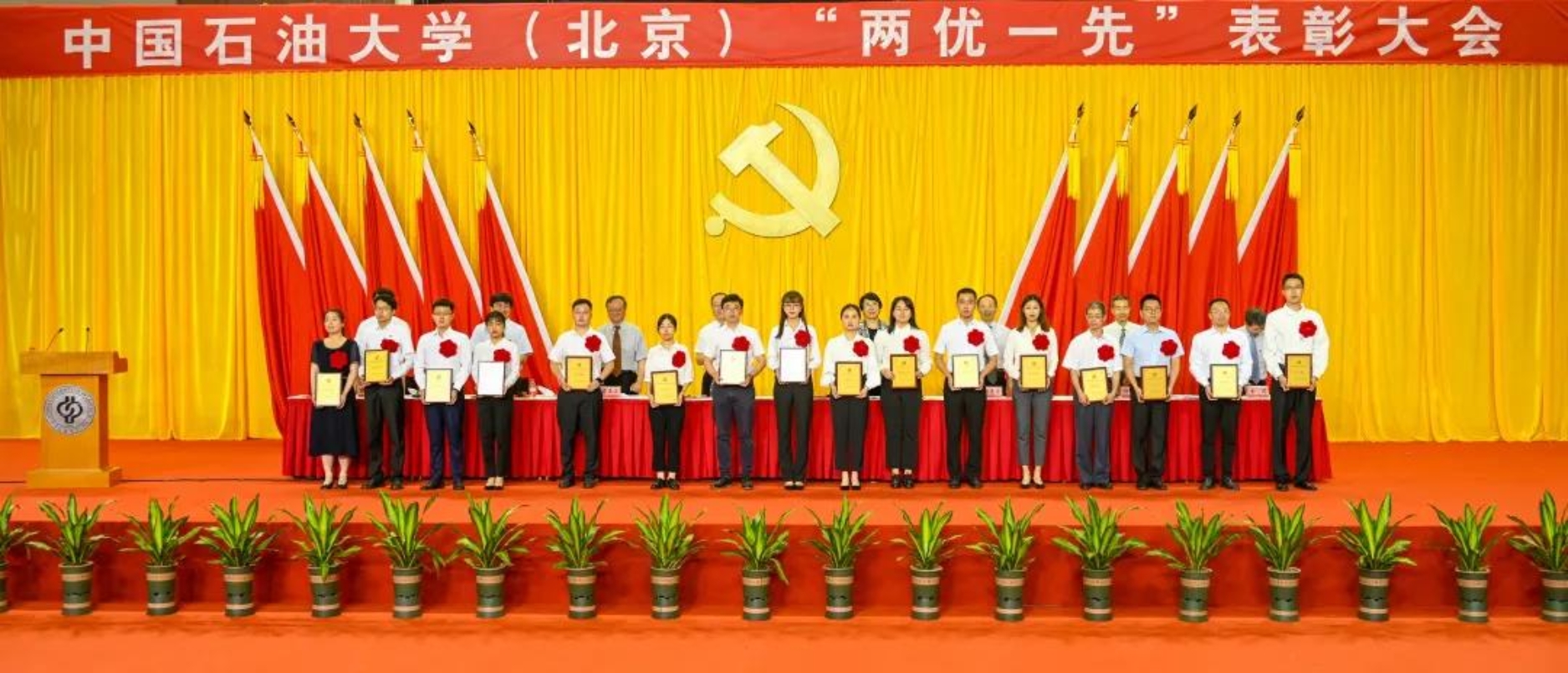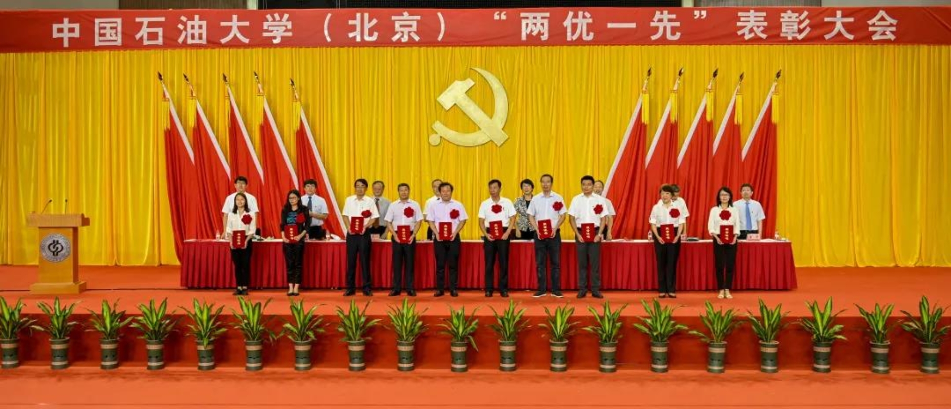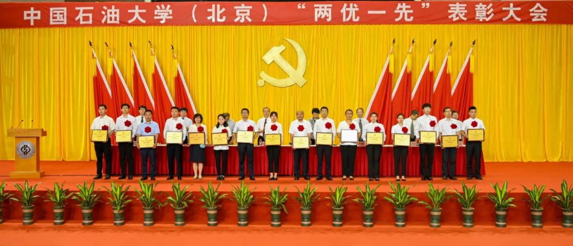 初心如磐,使命在肩。6月29日下午,中国石油大学在体育馆召开“两优一先”表彰大会,热烈庆祝中国共产党成立100周年,隆重表彰先进集体和个人。校领导陈峰、吴小林、雷玉江、鲍志东、韩克飞、付恒升、韩尚峰、金衍,校长助理刘植昌,“光荣在党50年”老党员代表,全体先进党组织书记、优秀共产党员和优秀党务工作者,其他受表彰单位和个人代表,全体处级干部、预备党员代表、师生党员代表等近460余人参加表彰大会。副校长陈大恩和克拉玛依校区师生党员代表通过视频连线方式参加了表彰大会。会议由校长、党委副书记吴小林主持。