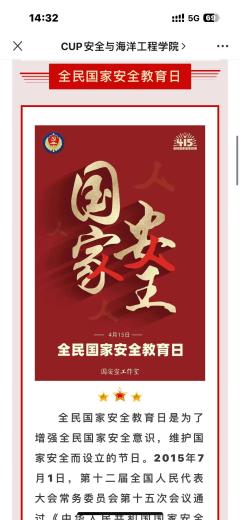 为进一步加强师生树牢总体国家安全观,不断增强全民国家安全意识和素养,提高师生履行国家安全法律责任义务的自觉性和主动性,筑牢国家安全的心理防线和思想防线,为维护国家利益、保证国家长治久安、安全发展,4月10日至15日,中石大安全与海洋工程学院组织开展2024年国家安全教育系列宣传教育活动。