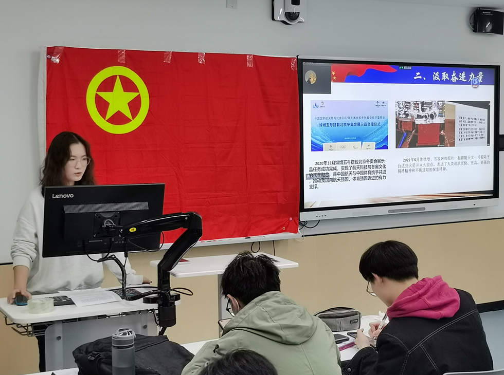 本石工20-1团支部书记刘晓旗的汇报以“绿色冬奥·聚焦双碳向未来”为主题,系统介绍了北京冬奥会及冬残奥会中我国为实现“双碳”承诺所使用的“黑科技”,展现了新时代负责任大国的责任担当。