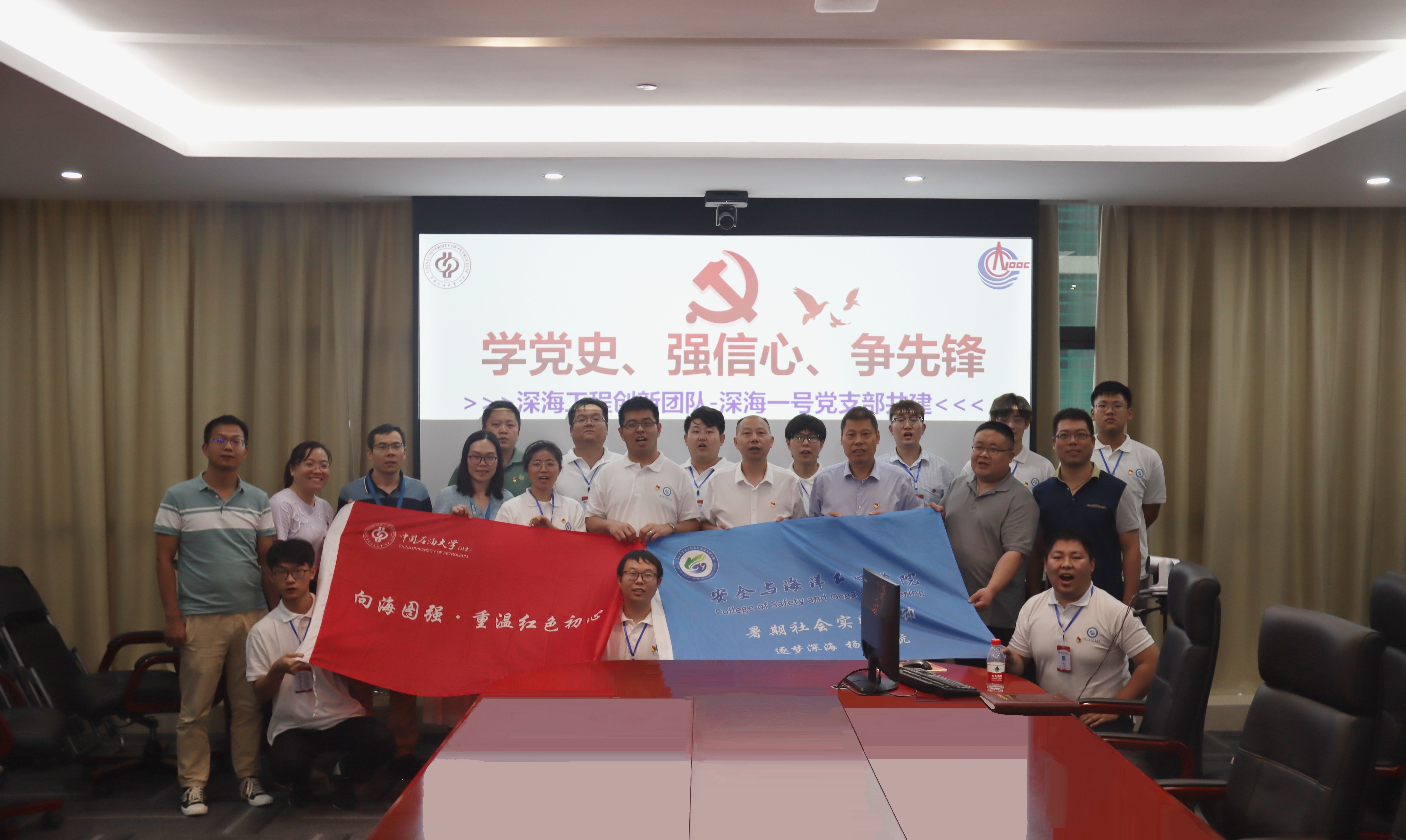 6月22日,中国石油大学(北京)深海工程创新团队党支部与中海油工程建设中心第三党支部开展共建交流活动。中海油工程建设中心副总经理刘孔忠,深水项目组总工程师刘新宇,中石大安全与海洋工程学院副院长杨进,中国石油大学(北京)海南研究院副院长殷启帅及深海工程团队创新党支部学生党员参加共建交流,会议由工程建设中心陵水25-1项目总工程师张勇进行主持。