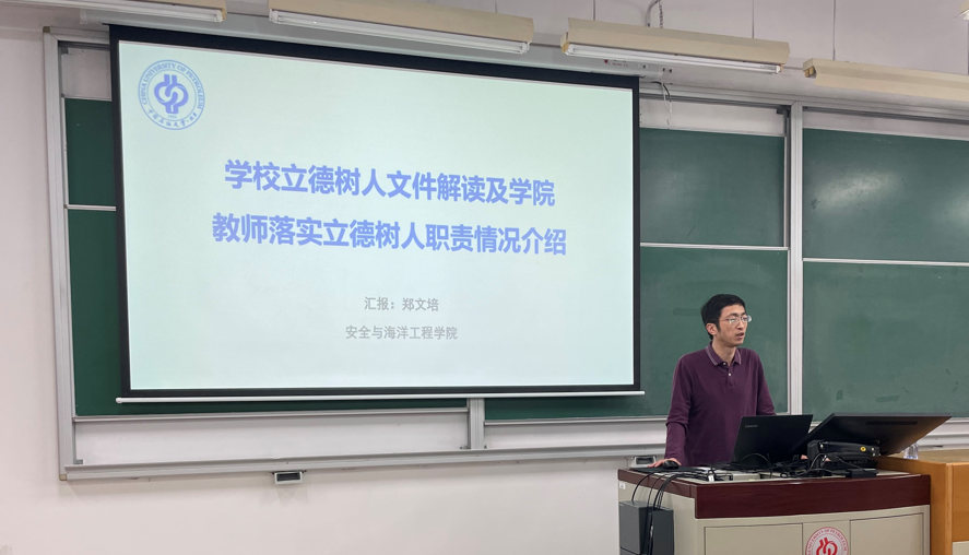 副院长郑文培为全体老师解读学校立德树人文件,强调教师应大力提升师德素养,将师德师风贯穿教学过程。并结合前期问卷调查工作,介绍了学院教师落实立德树人职责情况,帮助导师了解学生的真实需求,有针对性地进行有效沟通,给予学生切实的关怀。
