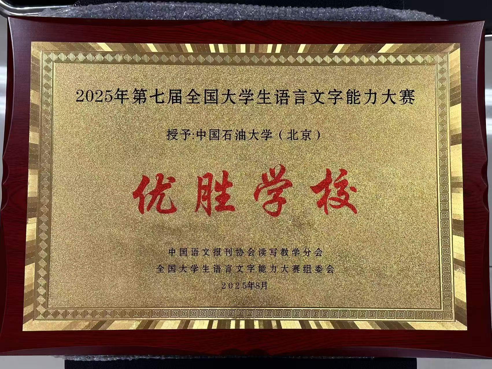 近日,中国石油大学(北京)被中国语文报刊协会读写教学分会及全国大学生语言文字能力大赛组委会授予“优胜学校”称号,标志着学院在语言文字教育领域的系统性建设和持续投入获得国家级权威认可。