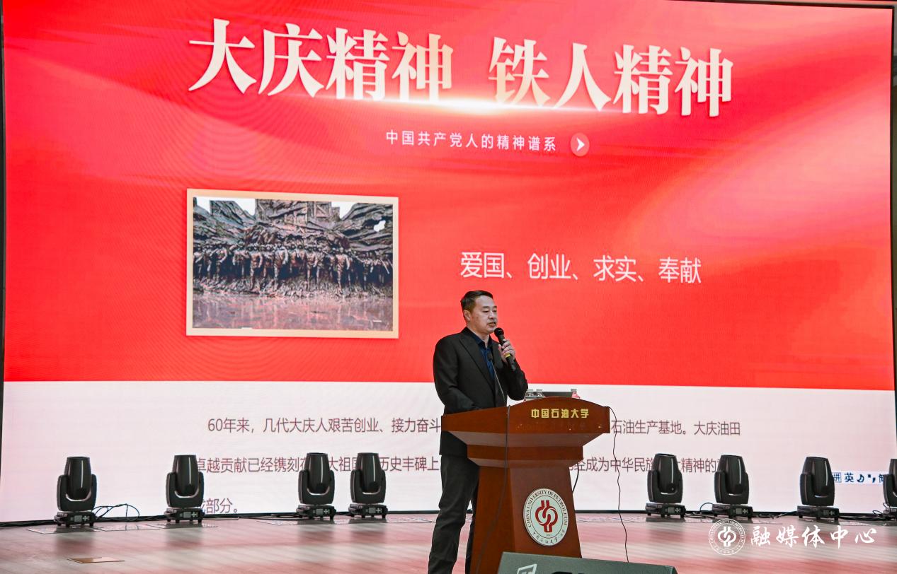 讲座中,王永桦教授创新讲授方式,以饱满热情开展沉浸式教学。他回顾大庆石油大会战的峥嵘岁月,阐释“爱国、创业、求实、奉献”的石油精神内涵,将经典石油歌曲与历史讲解穿插进行,让精神理念通过歌声与情感直抵人心。讲述铁人王进喜事迹时,他带领全场齐喊铁人劳动号子,铿锵号子仿佛再现当年创业场景,让师生真切体会石油工人奋勇拼搏的豪迈气概。