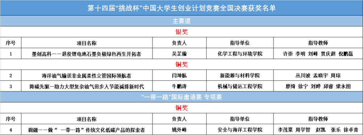11月2日,第十四届“挑战杯”中国大学生创业计划竞赛在西安交通大学闭幕,中石大《墨创高科——退役锂电池石墨负极绿色再生开拓者》等4件作品获得1银3铜奖励。