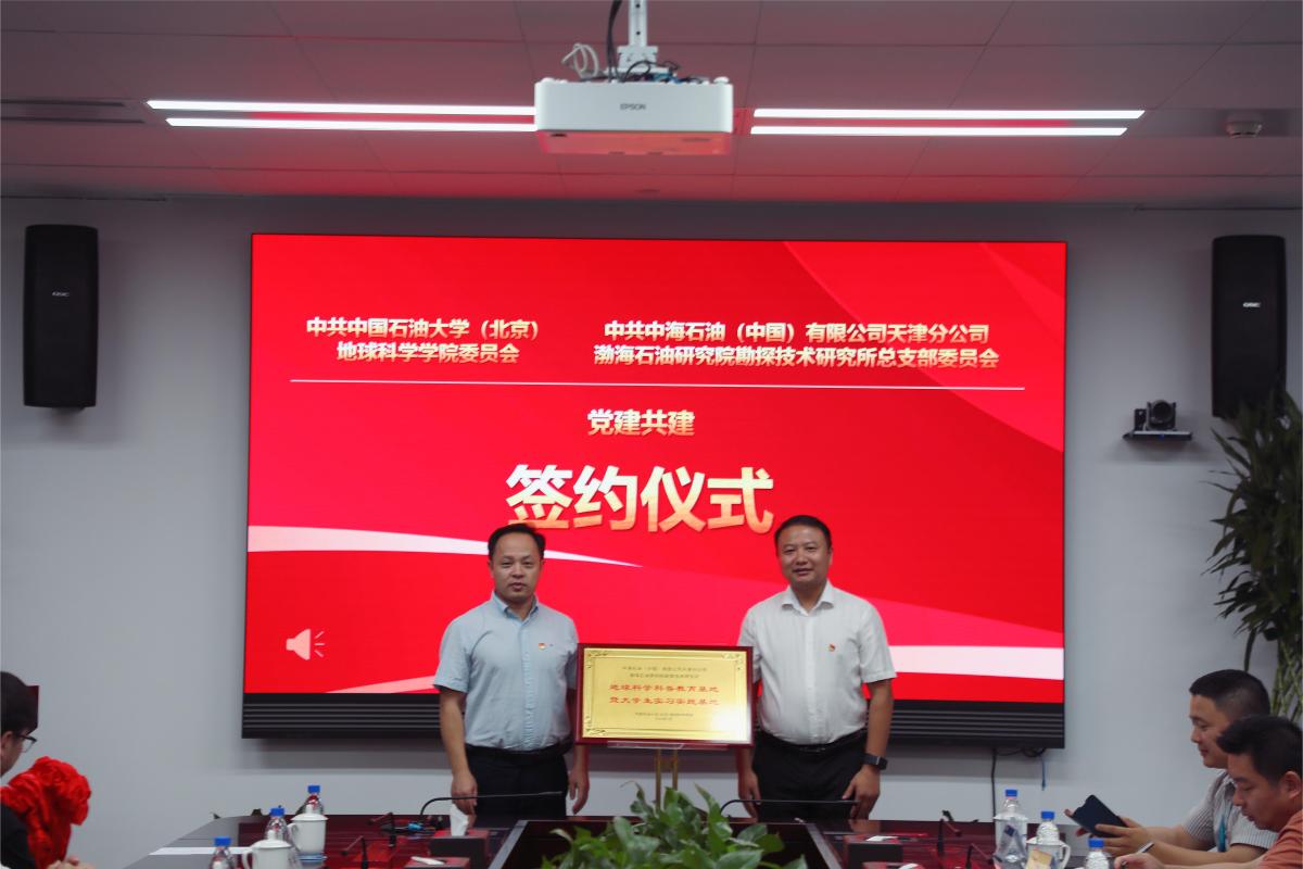 为全面贯彻落实习近平总书记关于能源安全新战略重要指示批示精神和科技创新的重要论述,深入推进党纪学习教育,创新党建活动载体,不断推动党建与科研深化融合,7月16日,中石大地球科学学院赴中海石油(中国)有限公司天津分公司渤海石油研究院勘探技术研究所开展党建共建活动,签署党建共建协议和地球科学科普教育基地暨大学生社会实践基地共建协议书,并为基地揭牌。