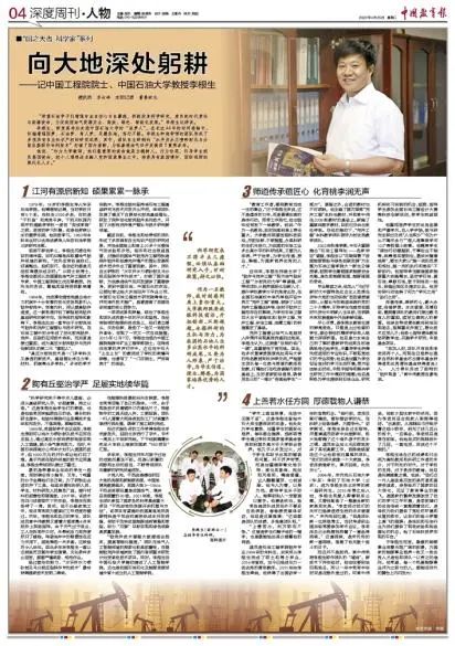 近日,中国教育报《深度周刊·人物》版面以“向大地深处躬耕”为题,整版报道了中国工程院院士中石大李根生教授的事迹。