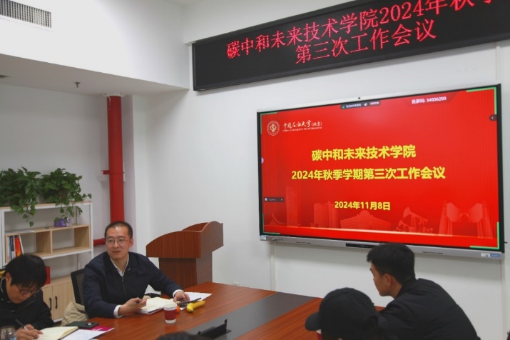 碳中和未来技术学院于11月8日在中油大厦824会议室召开了2024年班主任、学业导师交流研讨及工作部署会。会议由碳中和未来技术学院执行院长蓝兴英主持,副院长芮振华、书院学生工作负责人张嵩及学院各班主任、学业导师参加会议。