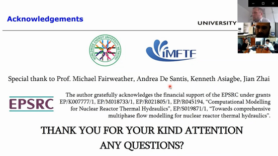 Dr. Marco Colombo would like to thank WEUN and IMFTF for the invitation. Subsequently, he gave a keynote speech entitled "Computational modelling of multiphase gas-liquid flows at different scale resolution". He provided examples of multiphase computational fluid dynamic modelling techniques with different applicability and scale resolution. Multiple examples of applications to bubbly flow dynamics, boiling and passive cooling of nuclear reactors were provided. In the final part, recent developments in generalized models, where interface resolving capabilities are embedded in multifluid frameworks, were discussed and outlook for future research provided. The report lasted for 50 minutes and 25 minutes of Q&A session.