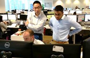 China University of Petroleum interns Li Zhan (left) and Steven Farfan shadow Daniel Colover (seated) during the Singapore Market-On-Close price assessment process.