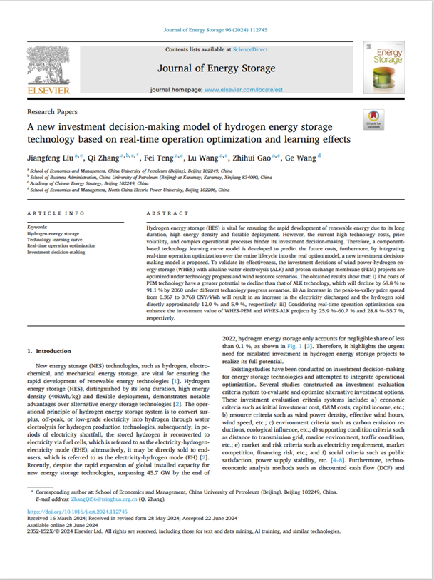 Liu J, Zhang Q, Teng F, et al. A new investment decision-making model of hydrogen energy storage technology based on real-time operation optimization and learning effects[J]. Journal of Energy Storage, 2024, 96: 112745.