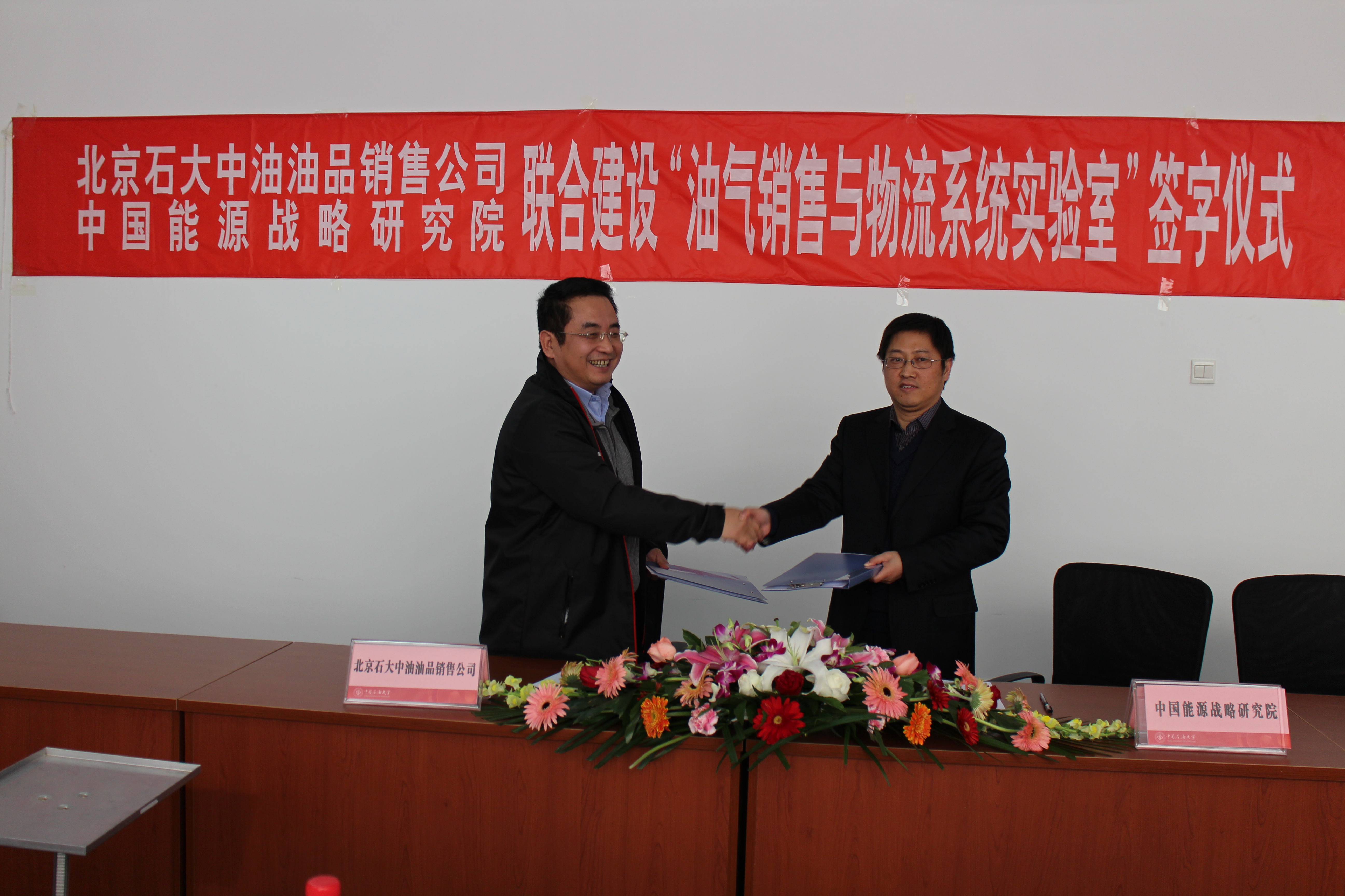 12月26日下午, 中国石油大学(北京)中国能源战略研究院和北京石大中油油品销售有限责任公司在位于化工科技园办公区会议室共同签订了《联合建设油气销售与物流系统实验室战略合作框架协议》。