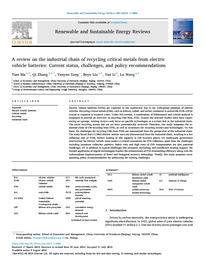 研究院博士生马甜(导师:张奇教授)、张奇教授等合作的论文“A review on the industrial chain of recycling critical metals from electric vehicle batteries: Current status, challenges, and policy recommendations” 在能源领域国际知名期刊Renewable and Sustainable Energy Reviews(SCI一区, IF=16.3)公开发表。
