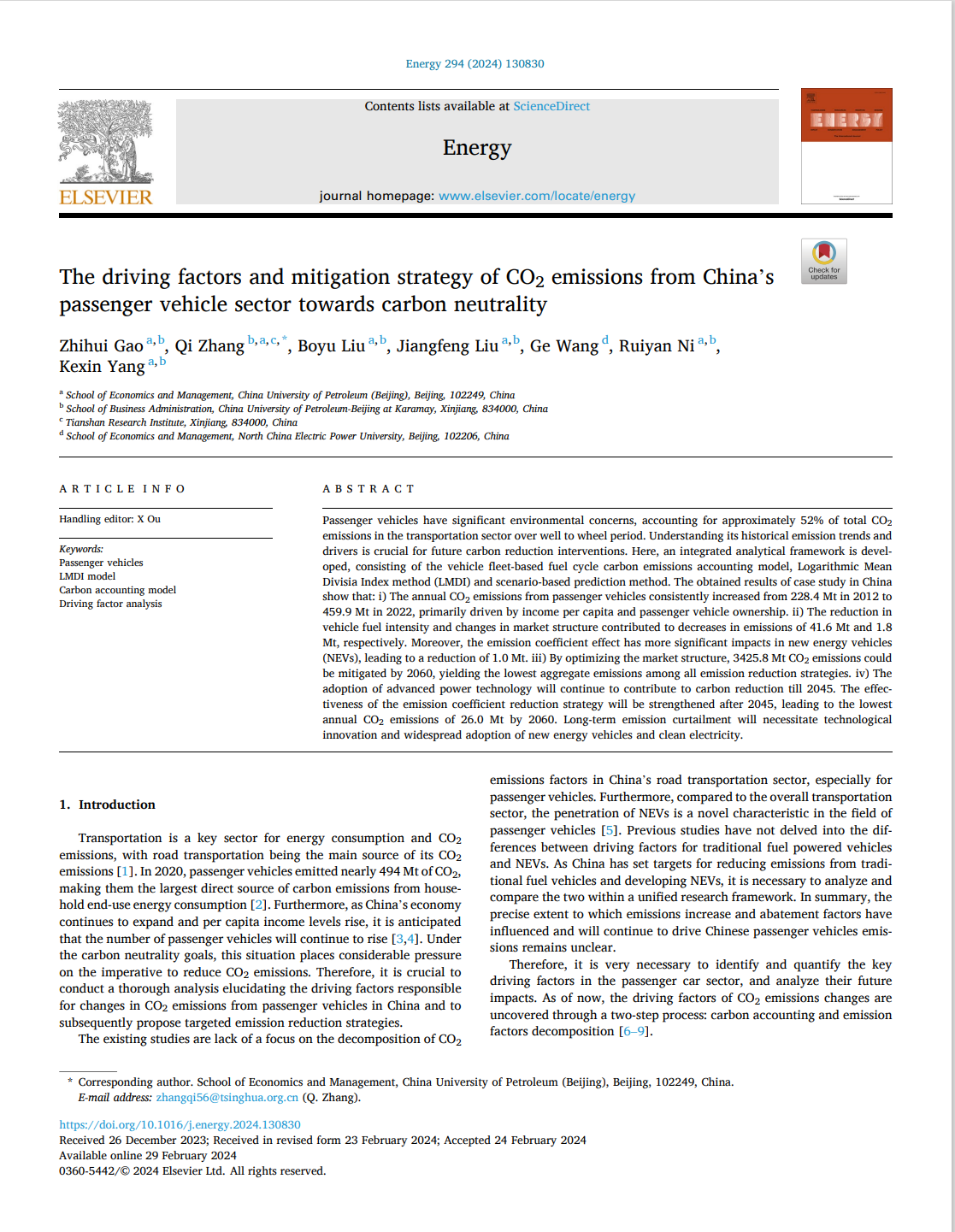 Zhihui Gao, Qi Zhang, Boyu Liu, Jiangfeng Liu, Ge Wang, Ruiyan Ni, Kexin Yang. The driving factors and mitigation strategy of CO2 emissions from China's passenger vehicle sector towards carbon neutrality. Energy, 2024(294),130830.