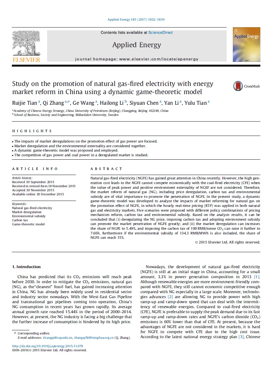 Study on the promotion of natural gas-fired electricity with energy market reform in China using a dynamic game-theoretic model