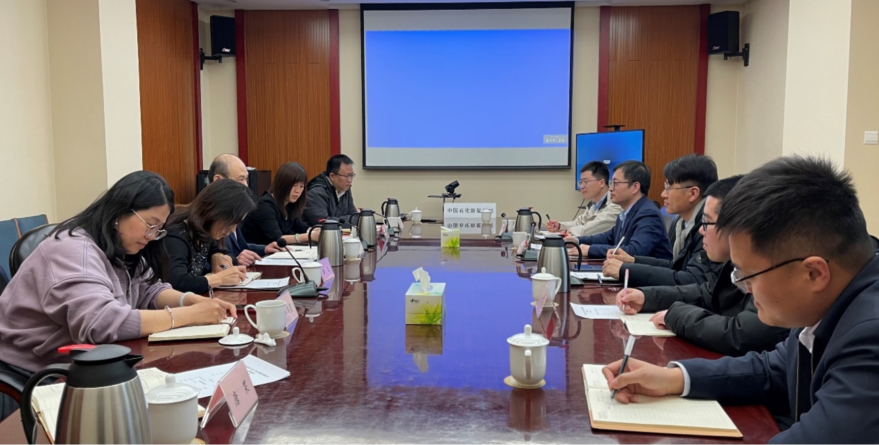 2023年3月3日,中国石油大学(北京)碳中和示范性能源学院执行院长宋先知带队赴中国石化集团新星石油有限责任公司(以下简称“新星公司“)走访交流,新星公司党委组织部副部长唐文、公司新能源研究院党委书记梁海军、副院长李瑞霞、综合管理部经理唐果、战略规划室主任黄嘉超以及中石化绿源地热能开发公司技术总监孙彩霞等参加了交流活动。我院副院长薛亮以及武晓光等相关方向青年教师随同参加。