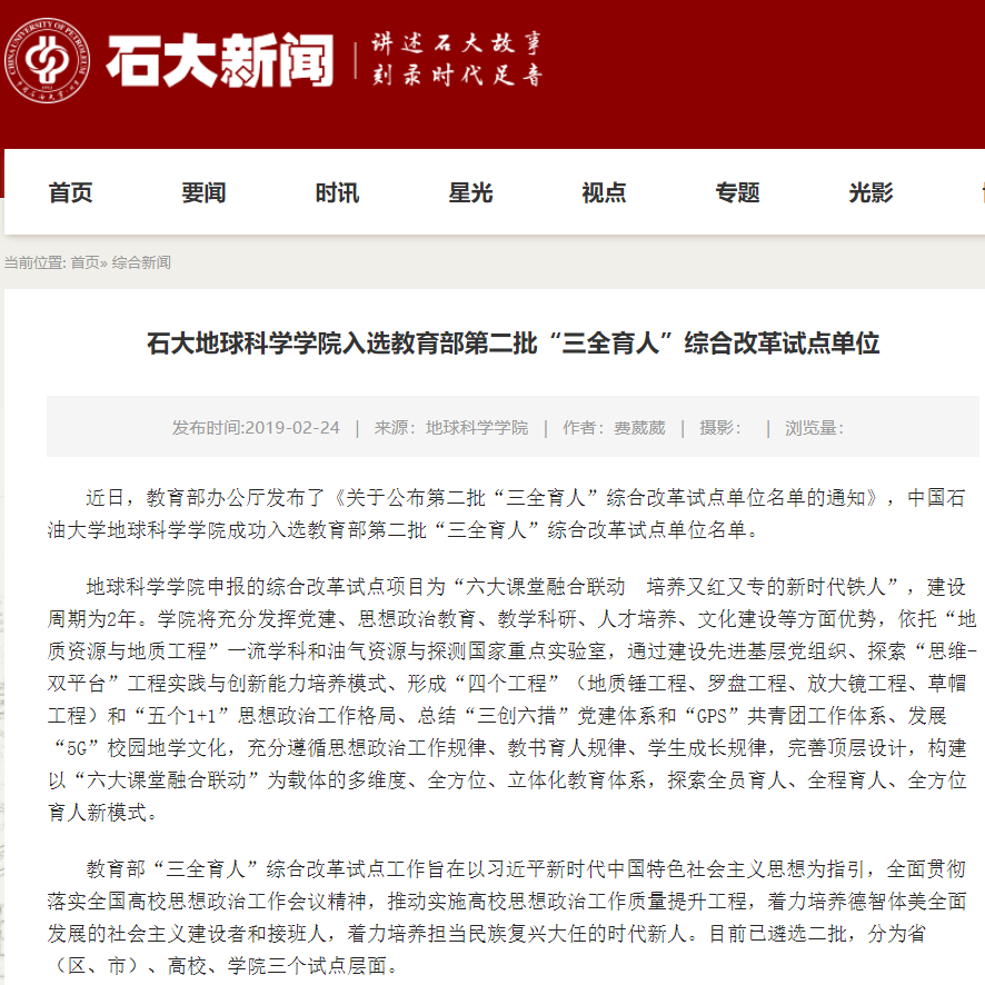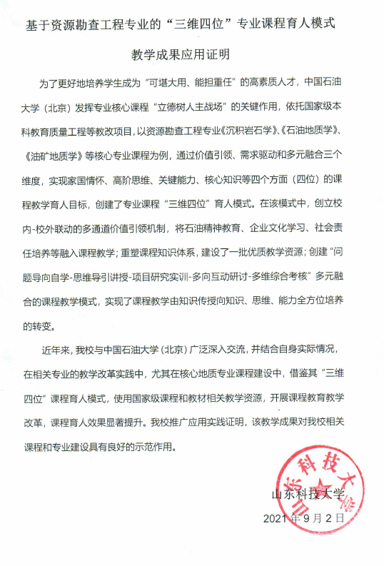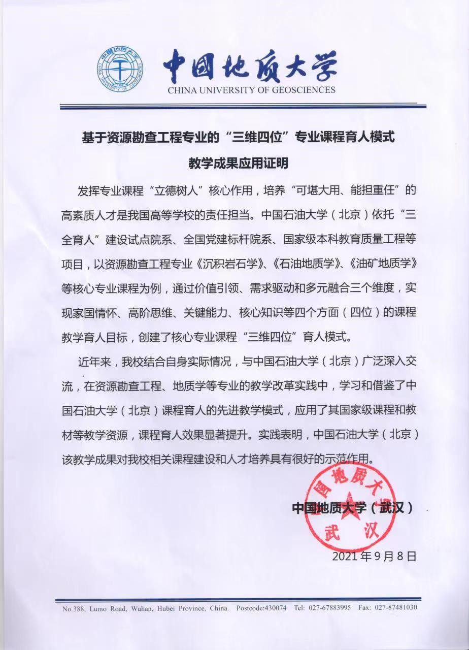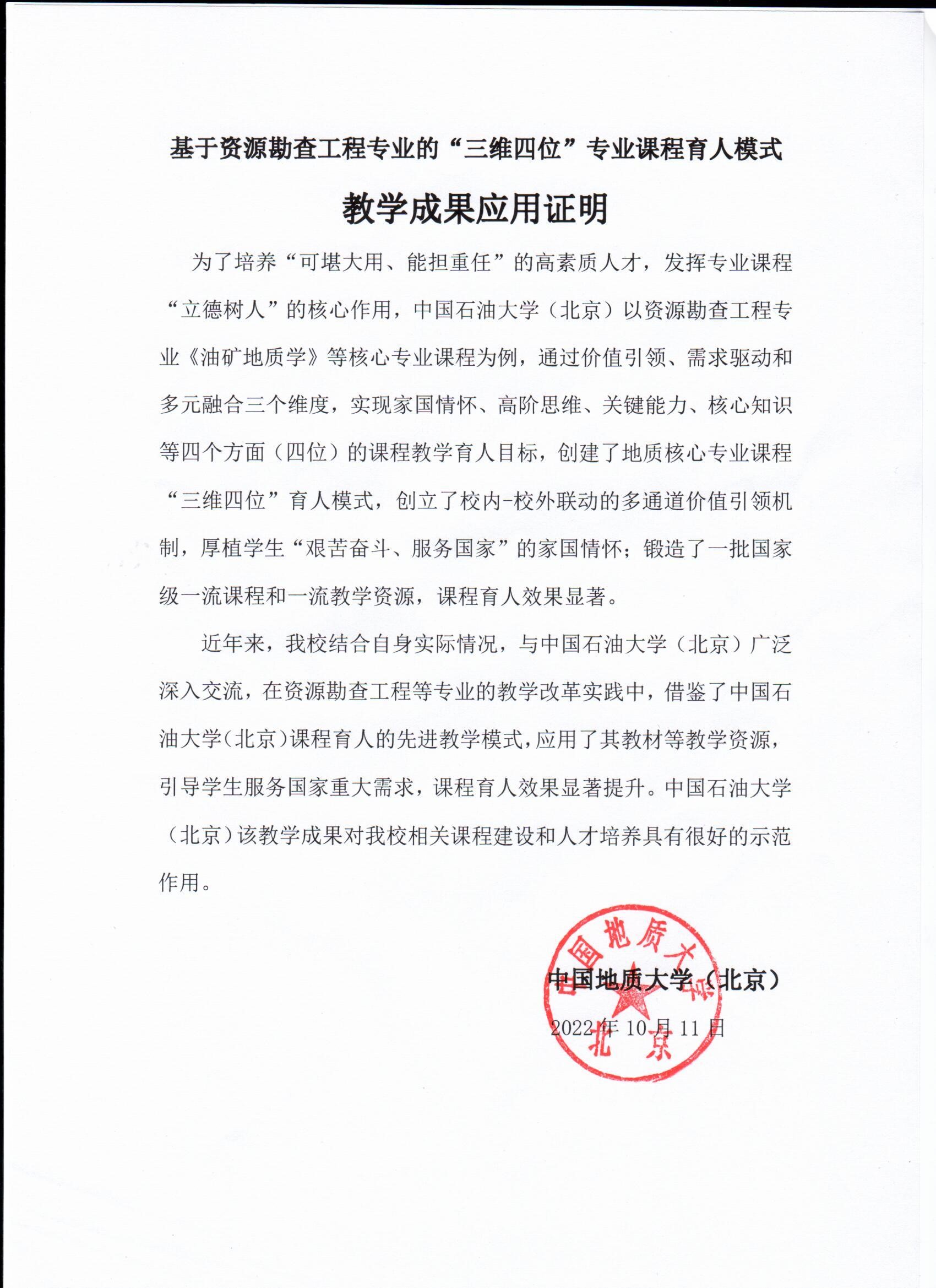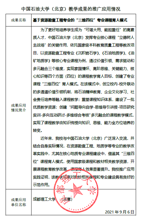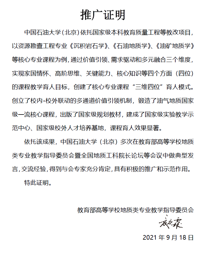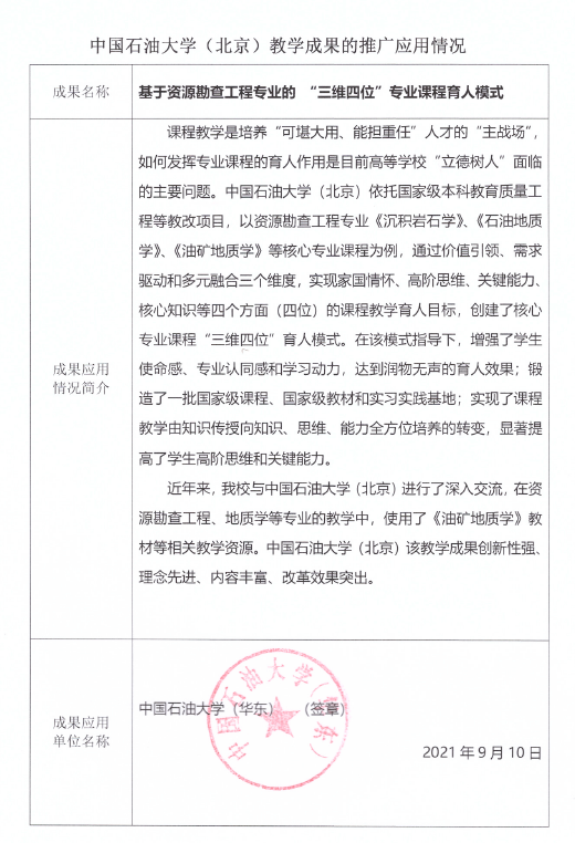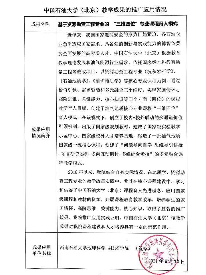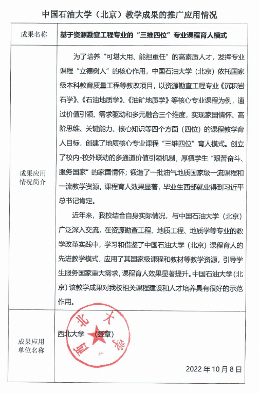 近年来,我校首创的“三维四位”专业课程育人模式已推广应用到我国全部石油高校及西北大学、中国地质大学、中国矿业大学等相关高校,并多次在教育部地质类教指委会议等大会做主题报告,对新时期行业特色高校人才培养起到重要的示范引领作用。