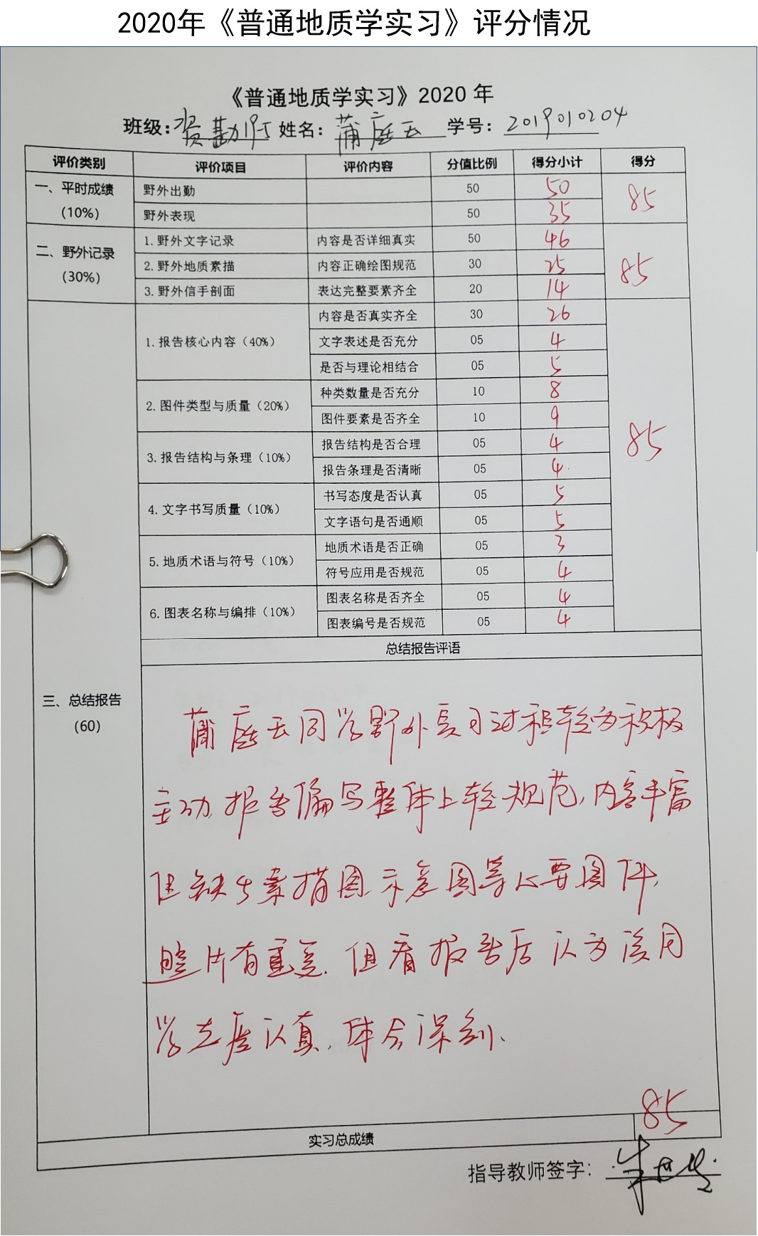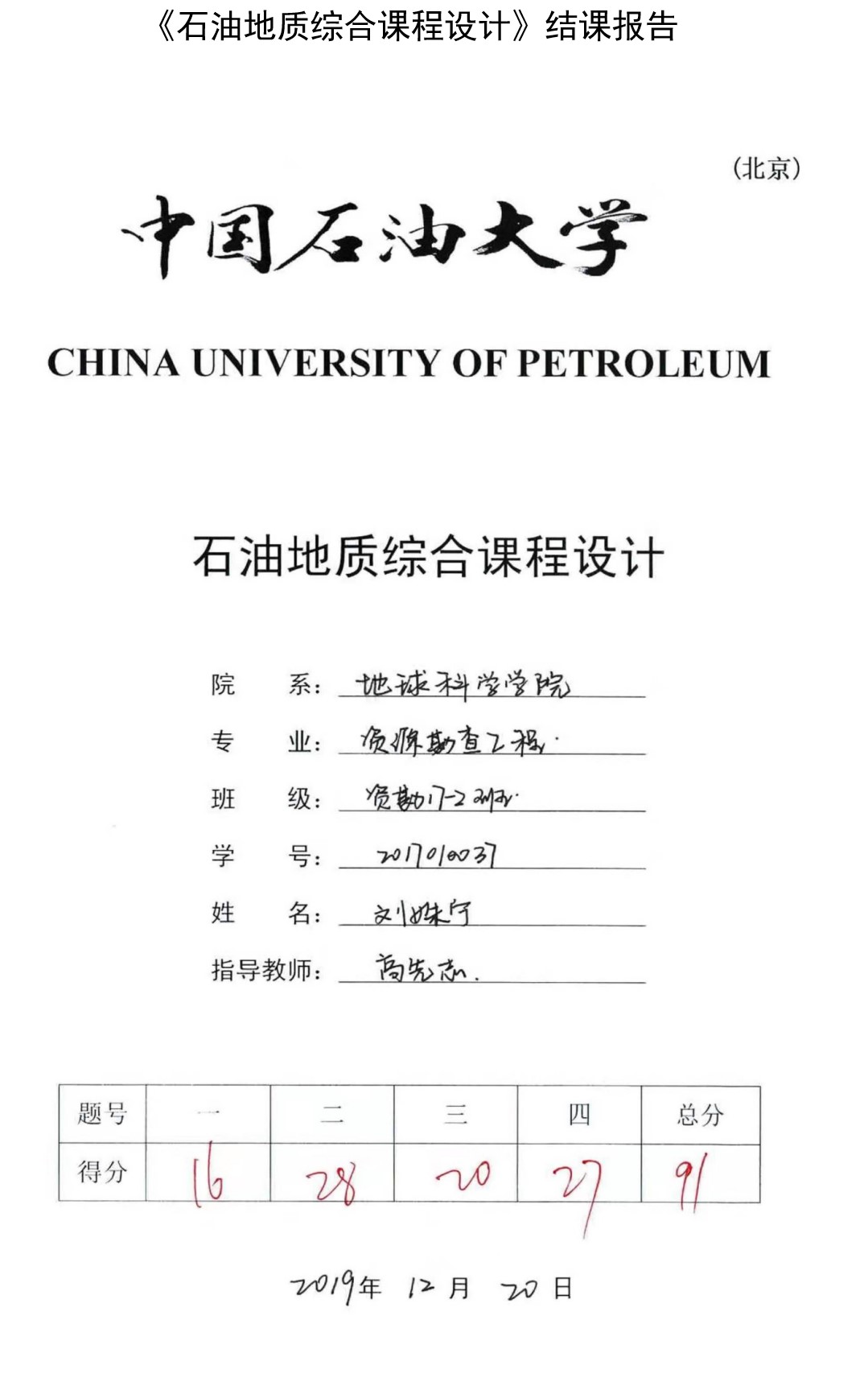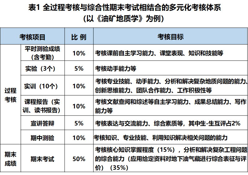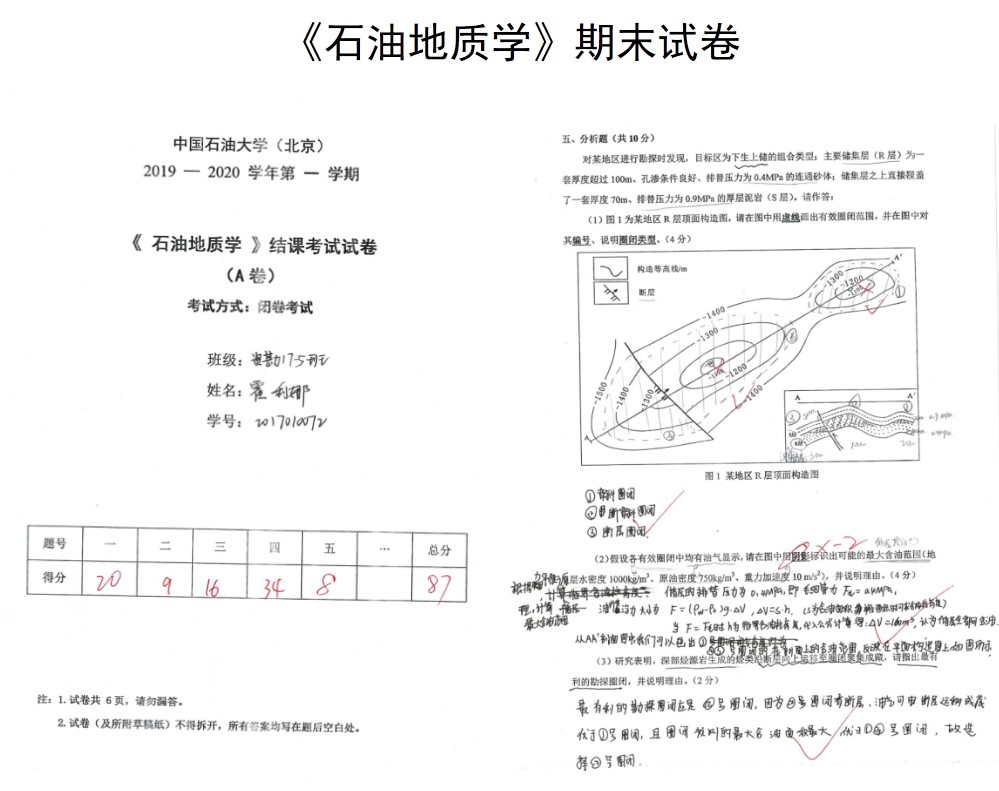 过程考核涵盖了前述各教学环节,包括平时和期中测验、实验、实训、研究报告、读书报告、宣讲答辩等,主要考核学生专业知识和技能、学习态度、自主学习能力、表达能力、团队协作能力等;期末考试中以具有一定挑战度的应用题为主,如要求学生应用给定的资料对地下地质体进行综合表征与评价,以考核学生分析和解决复杂工程问题的高阶思维和综合能力。