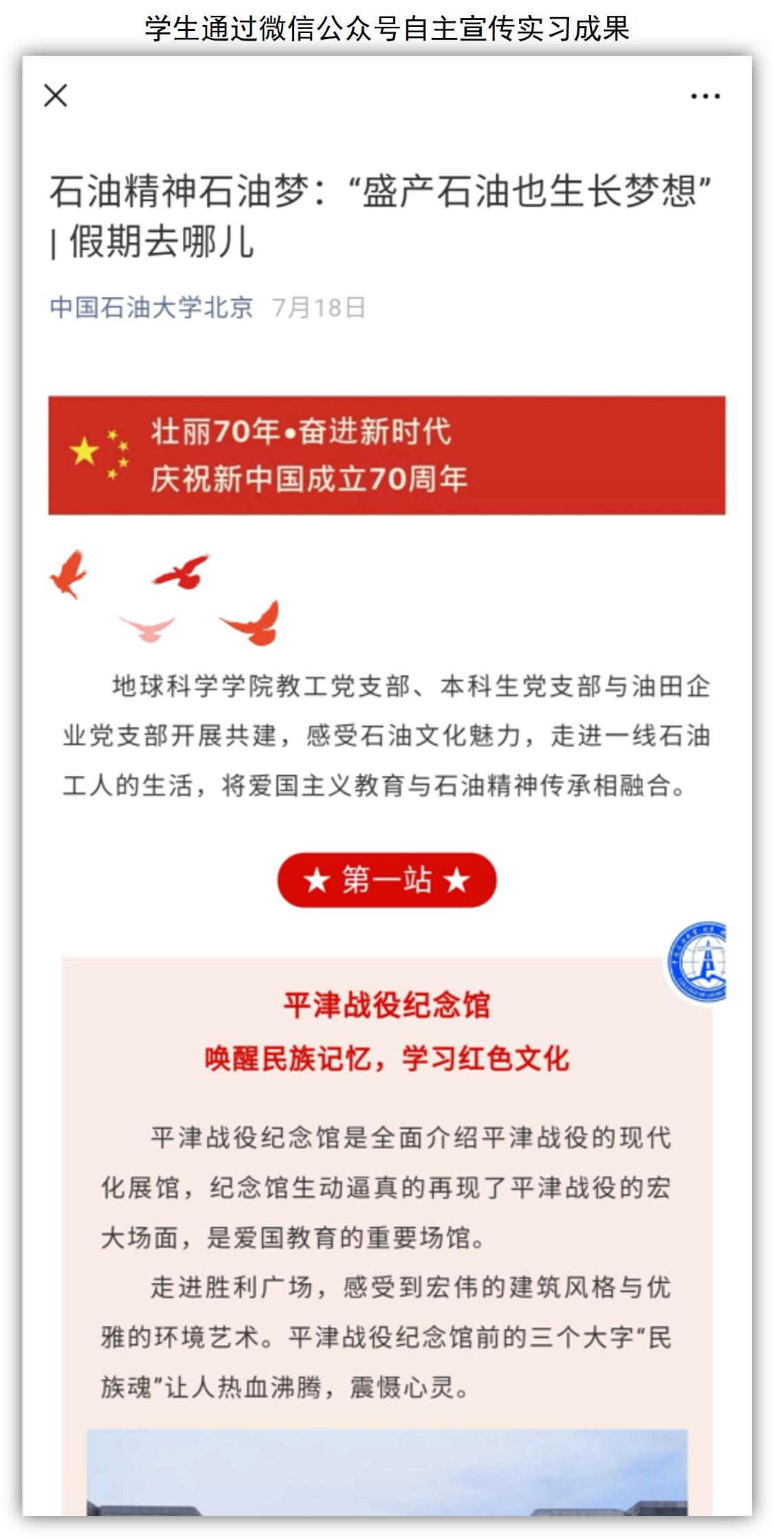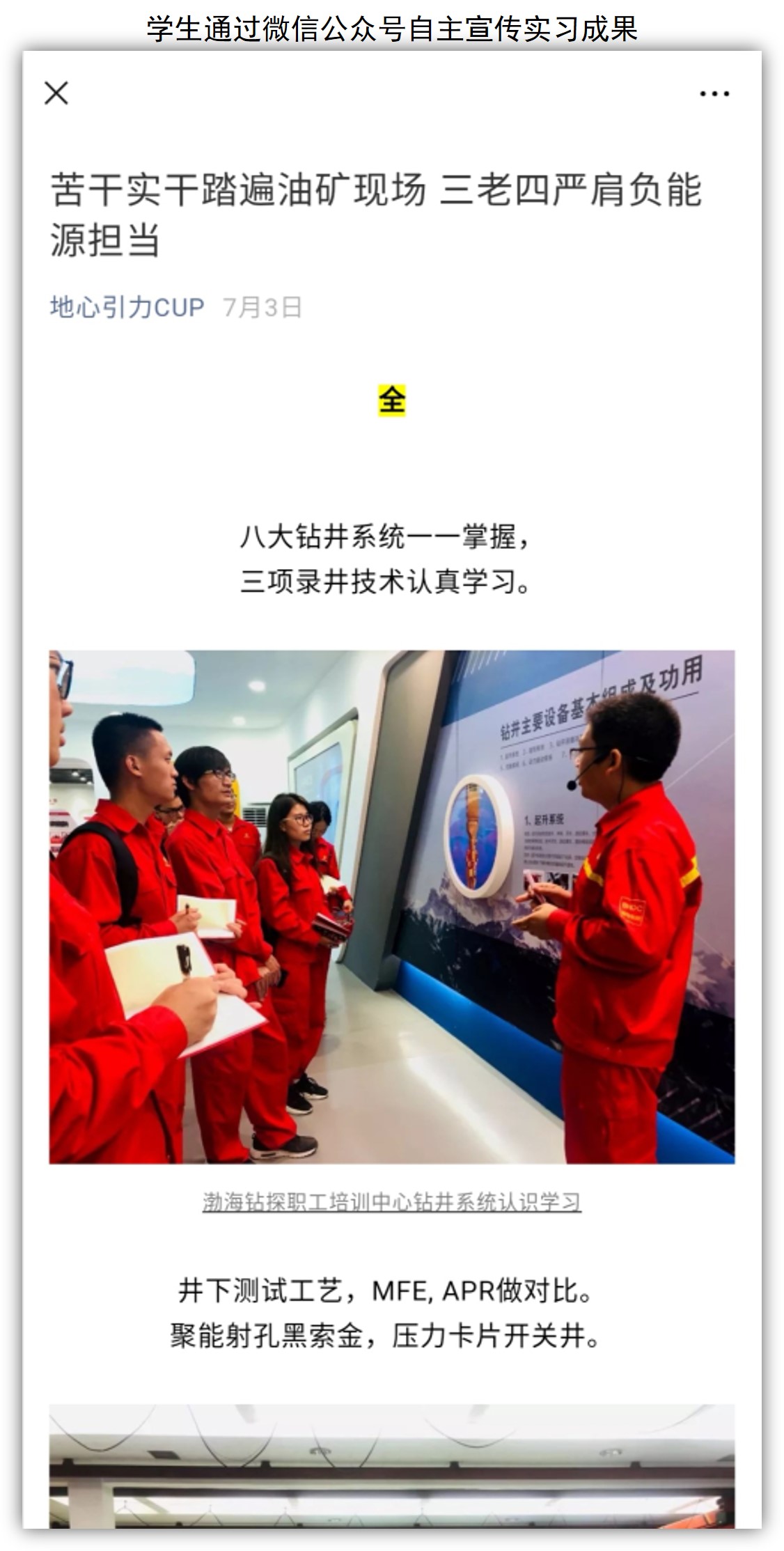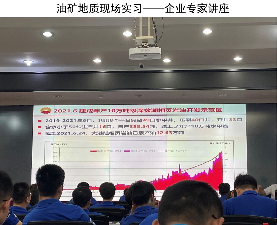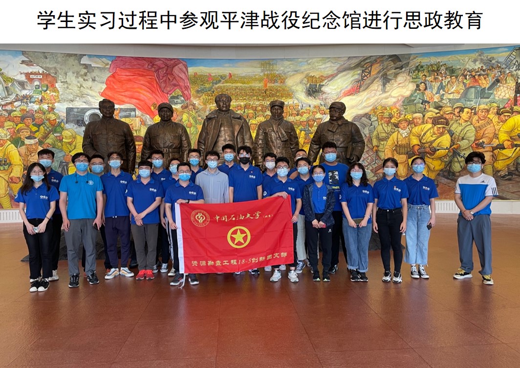 • 依托我校在大港油田建设的国家级工程实践教育中心,建成了“中国石油大学课程思政实践基地”。在《油矿地质现场实习》等实习实践教学中,实施油田劳模、专家和学校教师协同指导,将“爱国、创业、求实、奉献”的铁人精神教育、企业文化学习、社会责任培养等融入专业实践教学,培养学生“艰苦奋斗、服务国家”的家国情怀。