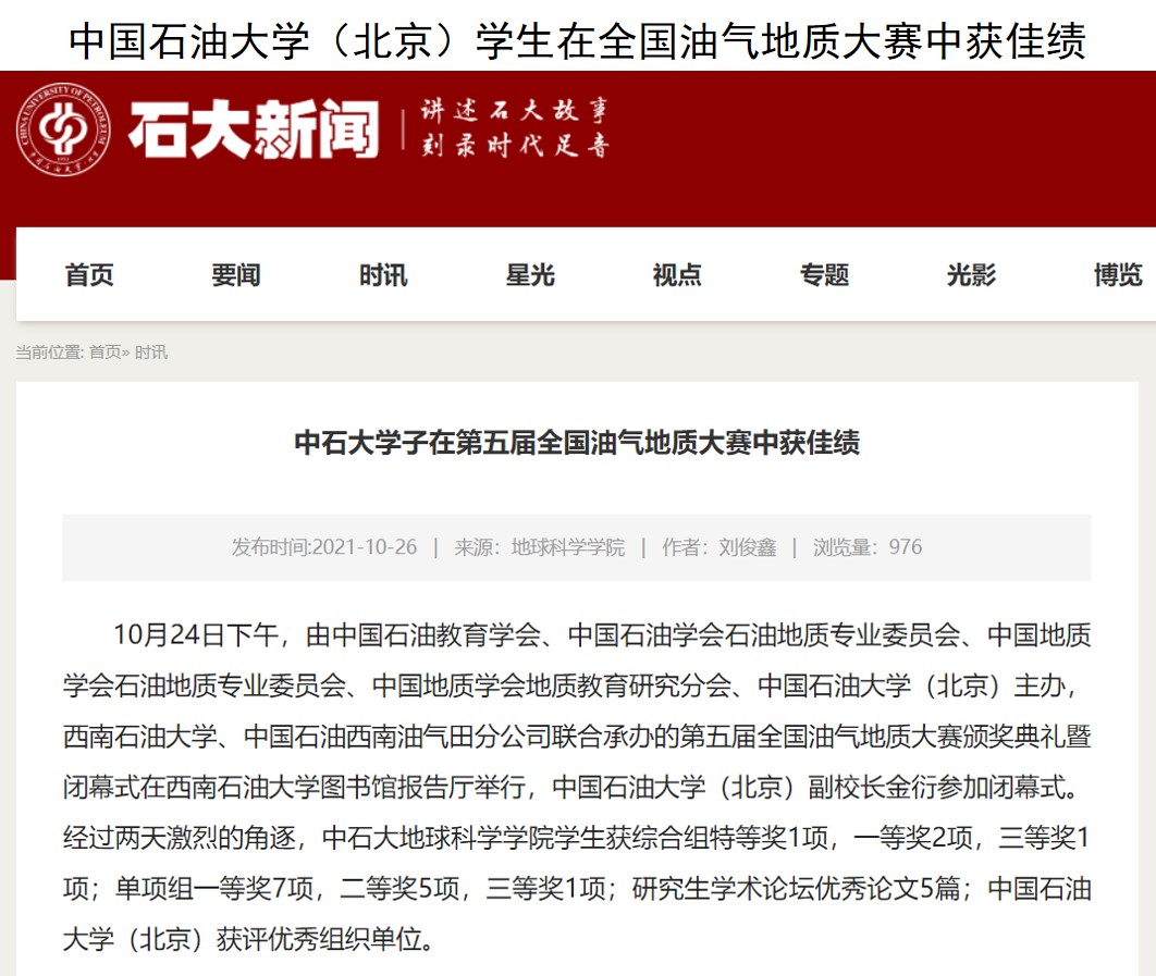 • 打造高级别专业赛事,将课程教学与学科竞赛有机配合,实施以赛促学。首创了全国油气地质大赛,学生基于油田实际资料和生产问题开展研究,以锻炼学生分析和解决复杂问题的高阶思维及创新实践能力。该大赛举办了5次,已成为我国石油行业最有影响力的赛事之一。