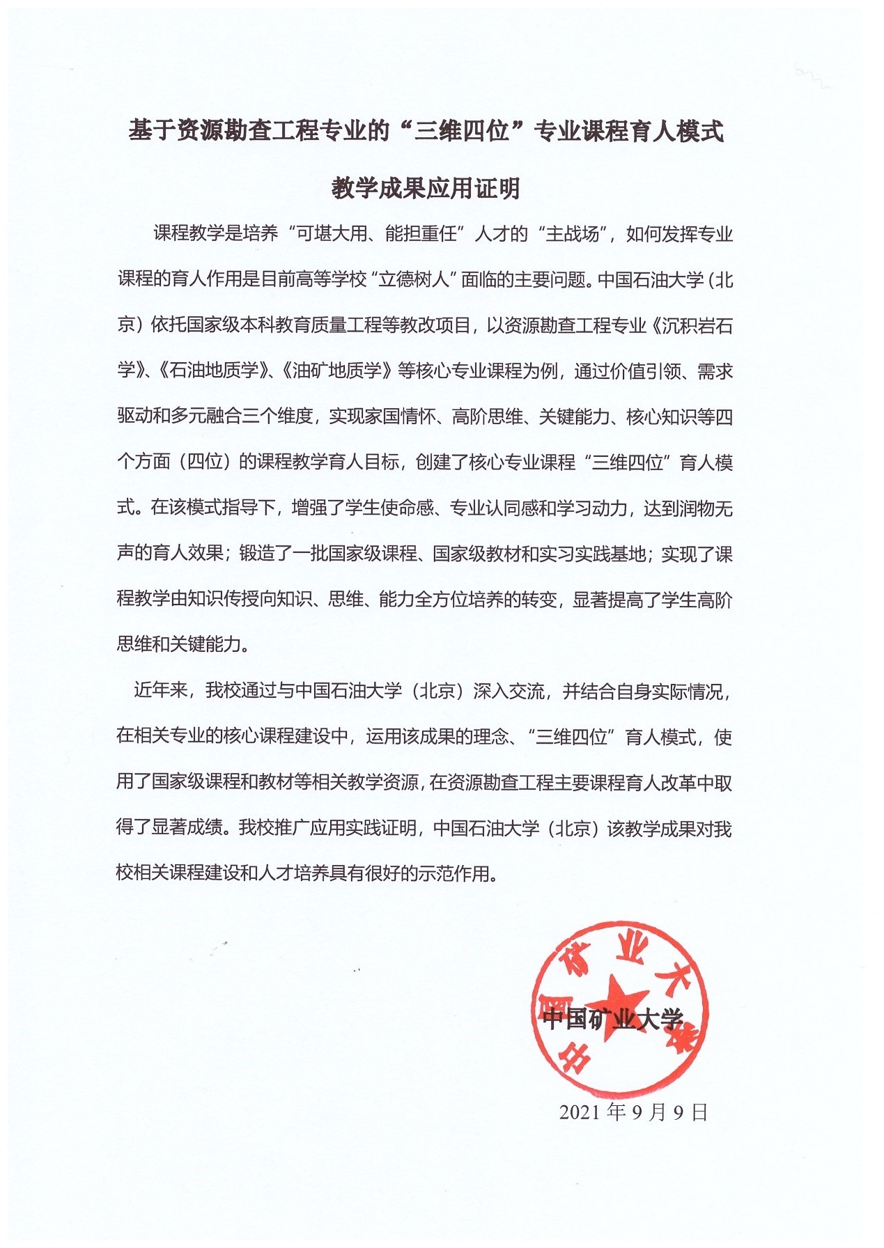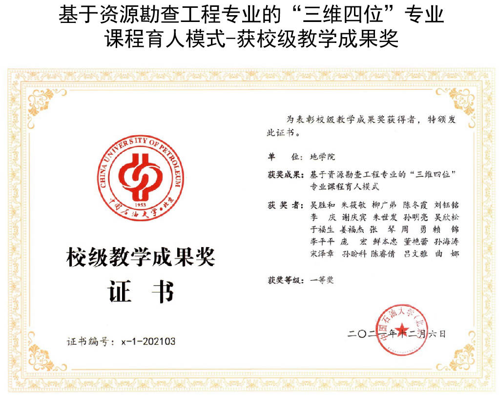 • 近十年来,中国石油大学(北京)依托国家级本科教育质量工程等项目,基于资源勘查工程专业核心专业课程的育人实践,通过价值引领、需求驱动和多元融合三个维度(三维),实现家国情怀、核心知识、高阶思维、关键能力等四个方面的课程教学育人目标(四位),创建了“三维四位”专业课程育人模式,取得了显著成效。