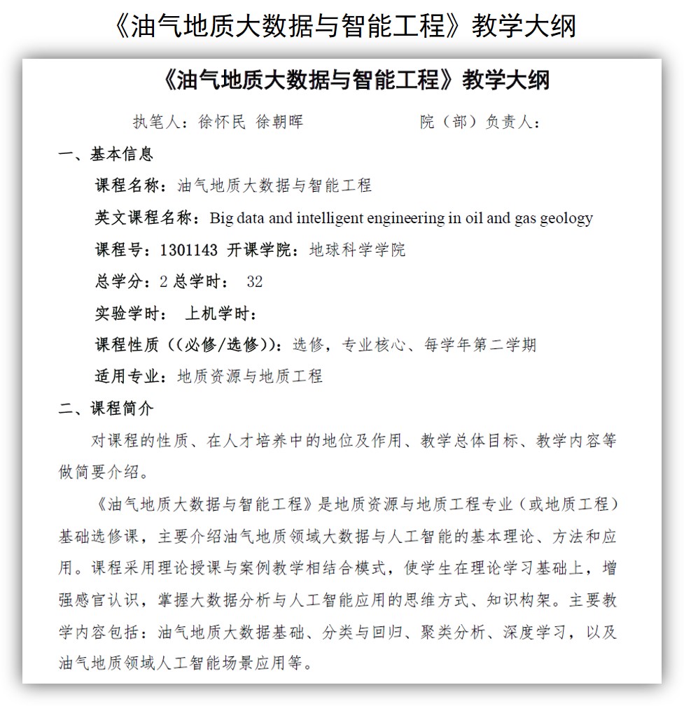 • 随着常规油气资源勘探开发的不断深入,非常规(如页岩油气)、深层、深水油气资源已成为我国油气能源重要的接替领域,勘探开发难度越来越大;与此同时,大数据、人工智能等学科的新技术蓬勃发展。为此,通过学科交叉融合,重构课程体系,并与时俱进地更新教学内容,如新设置了《油气地质大数据技术》课程,同时全面优化了所有专业课程的教学大纲和教学内容。
