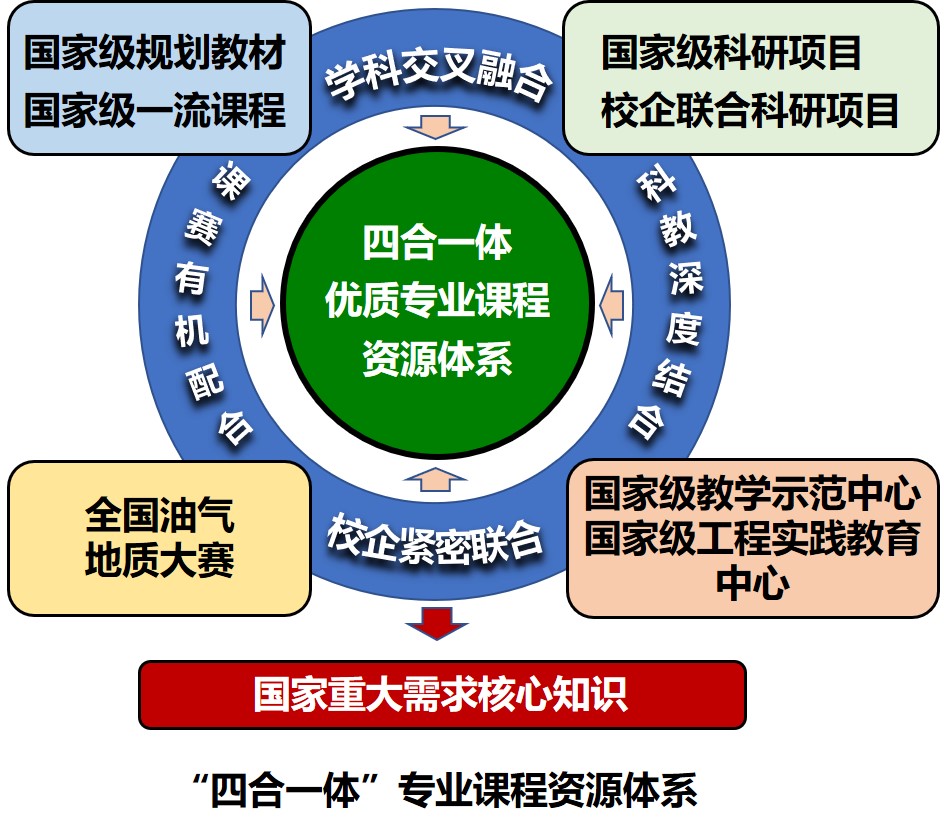 需求驱动拓展学生服务国家重大需求的核心知识。我国石油对外依存度已超过70%,油气能源战略安全形势严峻。基于能源产业发展的新需求和新工科发展的新态势,创建了“学科交叉融合、科教深度结合、校企紧密联合、课赛有机配合”的“四合一体”优质专业课程资源体系。